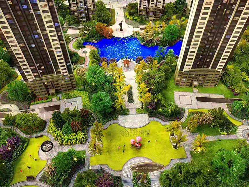 :恒大文化旅游城,水世界住宅沙盘,整体少景观部分采用仿真搞植物制作,建筑采用冷暖变换的灯光,建筑采用金属油漆上色。