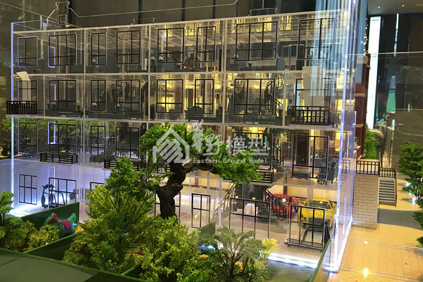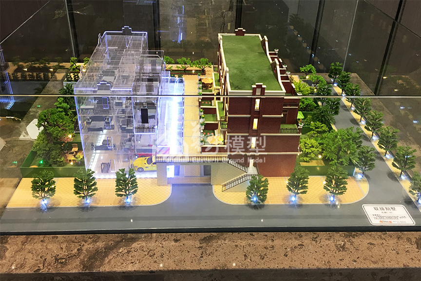 为了展示联排别墅内部装饰与多层结构,单体模型做了对照,一边是实景,透过隔窗能看见里面的各式家具,一边是对照,多复杂的别墅结构也一目了然。