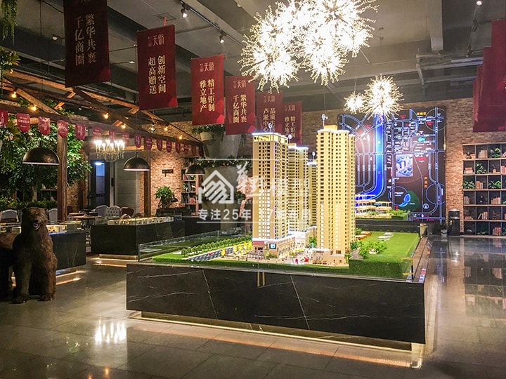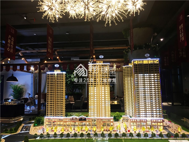 灯光照射在仿真树上散发出金色的光芒,与展厅内散花状吊灯相对照,让沙盘每一处都闪烁着动人的光彩。