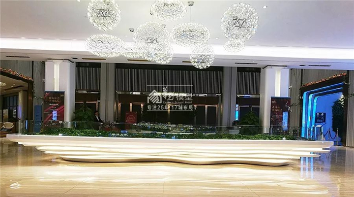 沙盘底座选用与之匹配的土耳其清水玉作为主体,同时让沙盘背靠落地窗,使参观者能更好的体验高层风景。