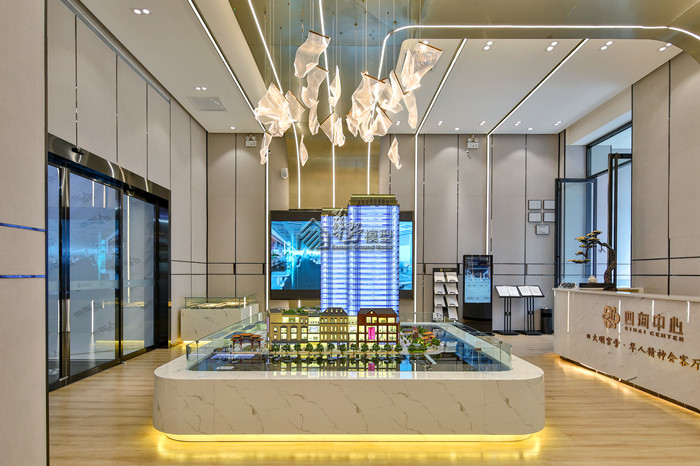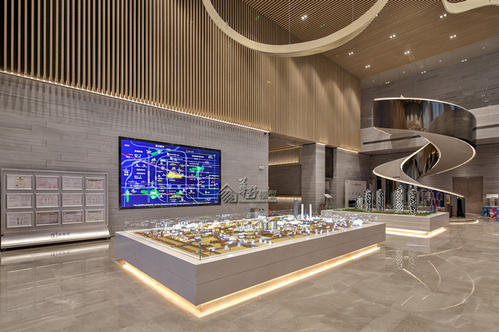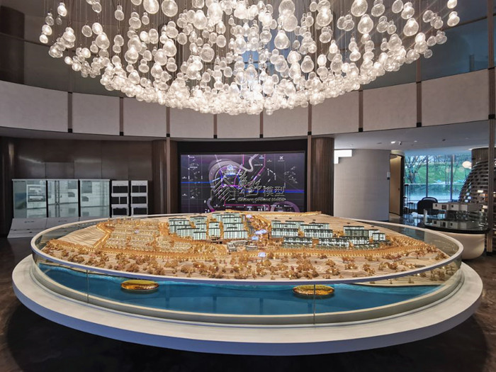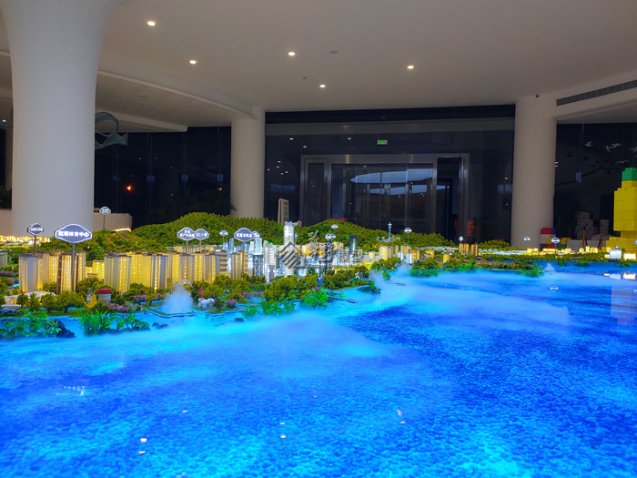 中铁双龙艺术小镇喷泉+雾森系统动态演示、透明屏幕+多媒体沙盘交互,营造出整体环境效果和感染力。