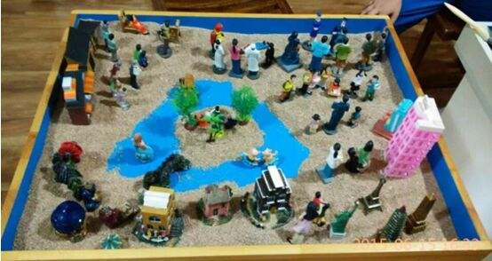 沙盘心里诊疗室在装修布置上以简约温馨的主题为主,在进行沙盘游戏时,有很多的模型供民众选择。模型有相拥的“夫妻”、身披龙袍的“皇上”等人物,有茶具等生活用品,有楼盘、房屋等建筑,还有形态各异的动植物等。这些模型的作用是来进行沙盘布置的。心里咨询室的工作人员根据需要进行心里诊断的工作人员让其在沙盘上摆出想要的造型。