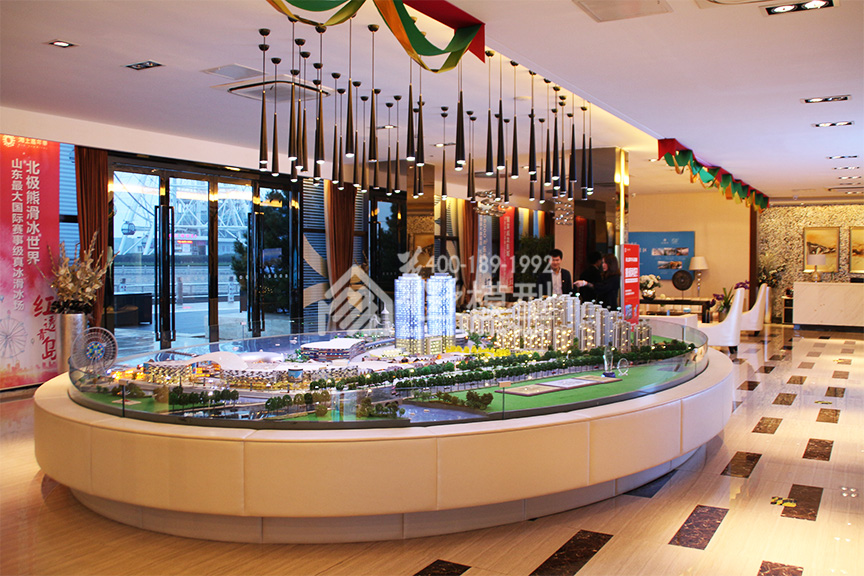 售楼处的大厅总是里摆放着一个巨大的沙盘模型,有的沙盘带有互动功能,以增强参观者对该楼盘项目的印象,有的沙盘模型带有投影功能的沙盘模型,是为了增强营销氛围与项目信息立体化,目的都是为了让楼盘项目更好的展示出来,增加销售业绩。