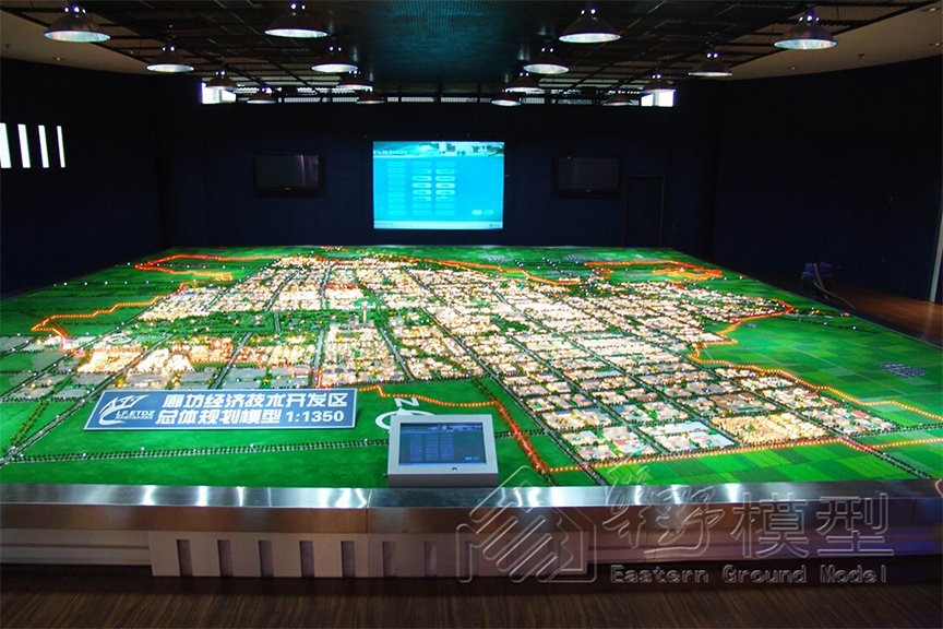 工业方面的规划沙盘模型,主要是展示工业园区建设规划及区域总体工业园区规划。这两种规划主题也是主题展示范围性的问题。总体区域工业规划与园区详细规划这一大一小展示主题,这样的工业规划沙盘模型也是在政府单位与工业园区开发商处可见。如华野模型公司制作的河北廊坊经济技术开发区总体规划与广元市利州区生态文化旅游产业园等规划沙盘模型。