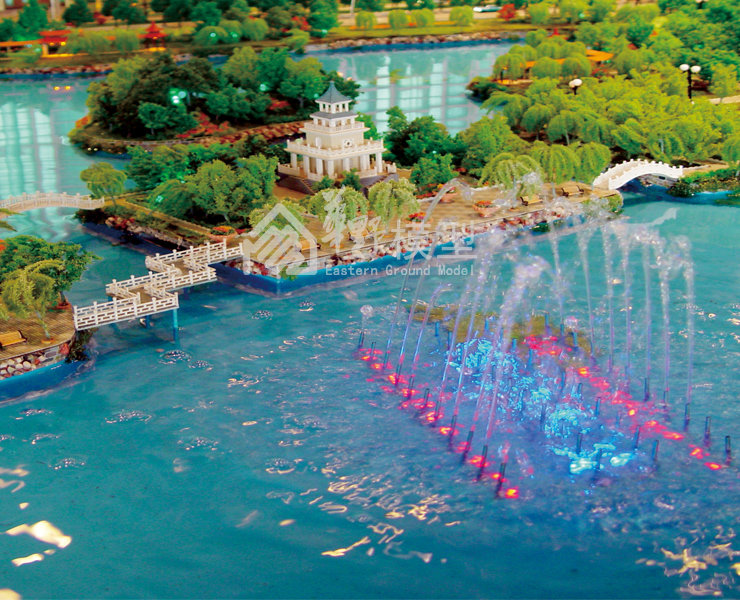 公园内,有亭子、湖中岛、喷泉、植被等景观,华野模型公司将喷泉采用真水喷射,随着灯光或音乐的旋律进行定时定点展示。将公园中的场景细细的描绘出来。