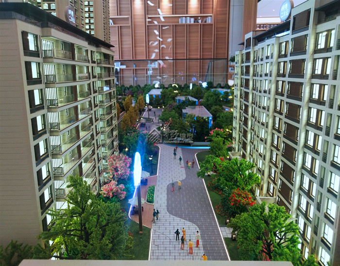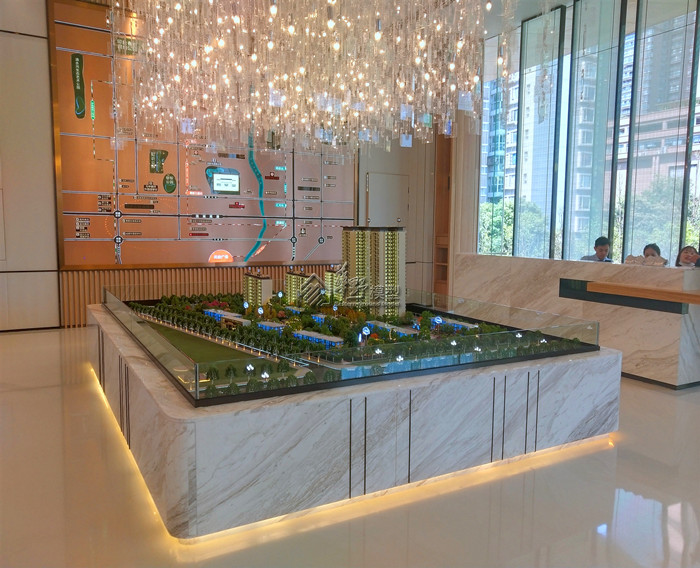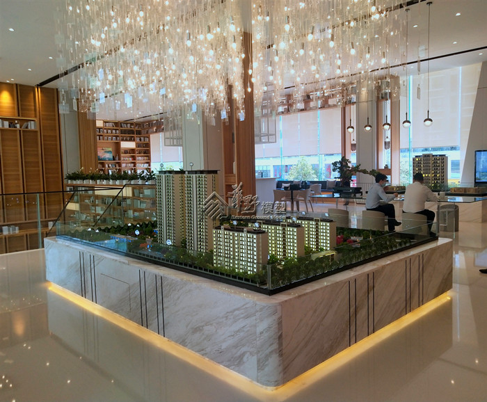建筑:高层建筑全写实制作、8F全写实制作、商业全写实制作。10F8个单元写实制作其他镜面体块模拟代替,通透灯光、内贴银箔纸凸显双重视觉效果 景观:全写实制作,定制水系采用真马毛制作,3D打印隐藏式灯光 区域:拉丝铝板材质 洋房单体:写实制作选层展现2层(5层及大堂)内部业态,体现局部园林. 平层户型:采用写实制作,定制豪装(3套)