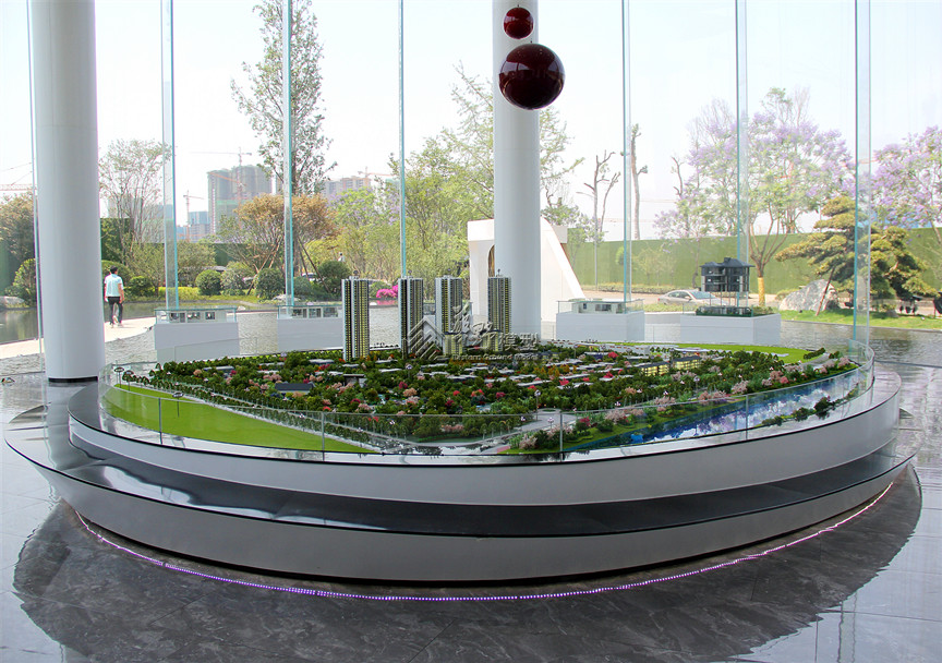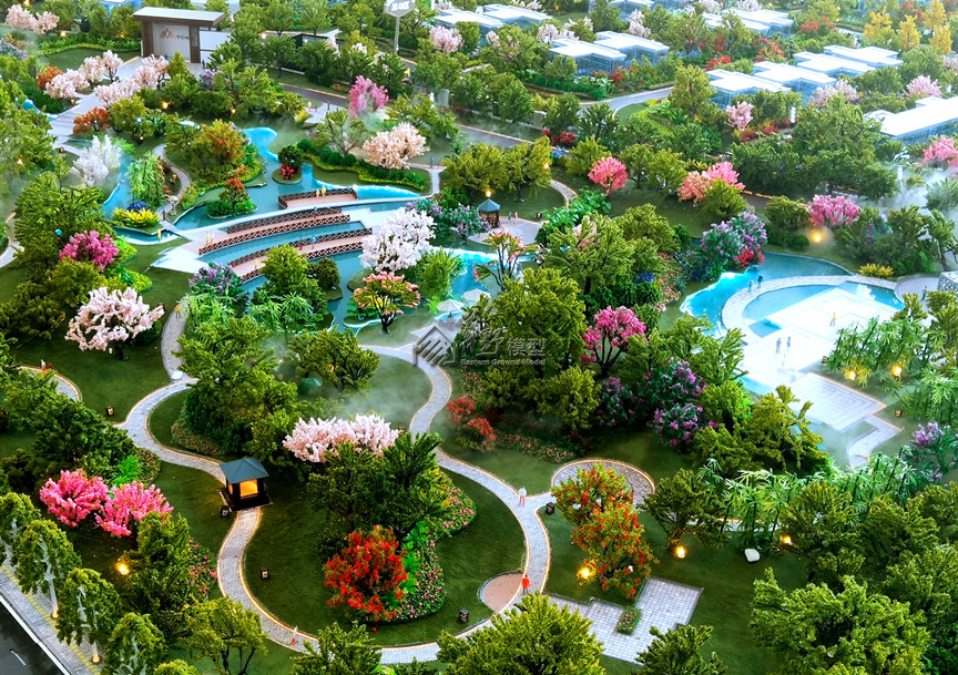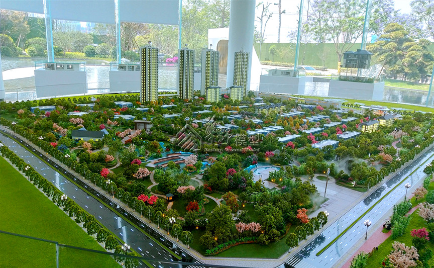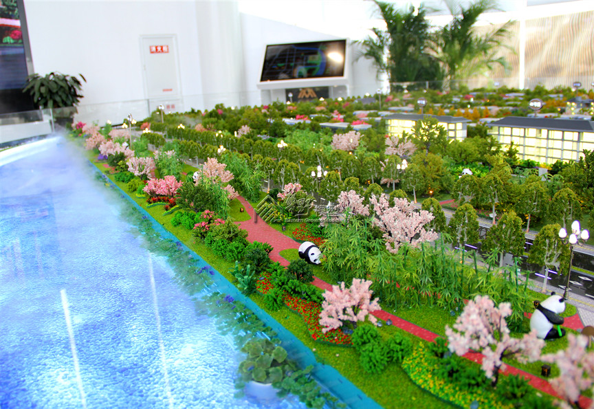 景观:景观全部写实,项目内部加马毛,公园写实,绿化风格不要太深,铺装采用3D打印底部透光制作,,马路采用不锈钢制作,周边公园制作出来,重点表现项目内部5大景观节点.入口处和游泳池做雾化,公园做雾化,入口处景观重点制作,景观做出五重层次.河流采用真水雾化制作,制作层次感,周边空地打项目LOGO,针对公园和项目内部绿化重点打造.