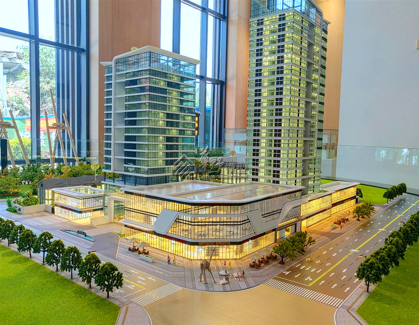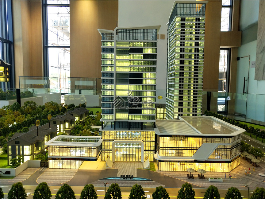 高层建筑:配套水街建筑采用写实制作,建筑全写实制作、商业写实制作内部业态。酒店采用大方格变化灯光、公寓采用整体通透灯光,内部贴银箔纸,商墅采用明黄色调常亮灯光;