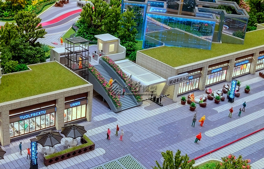 建筑: 建筑部分写实,其他建筑采用镜面玻璃制作.商业全部写实建筑内部加银铂采用暖白色灯光制作,整体通亮,灯光楼栋号亮灯 景观:景观全部写实,公园写实,绿化风格不要太深,铺装采用3D打印底部透光制作,马路采用3D打印制作,景观做出五重层次.周边空地采用LOGO表现, 区位:区位采用拉丝仿铜制作,底座踢脚线打灯光