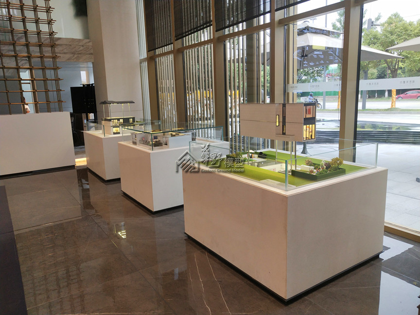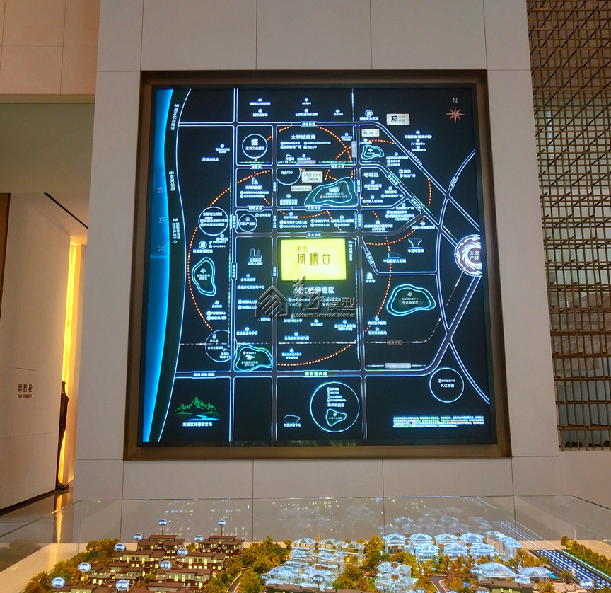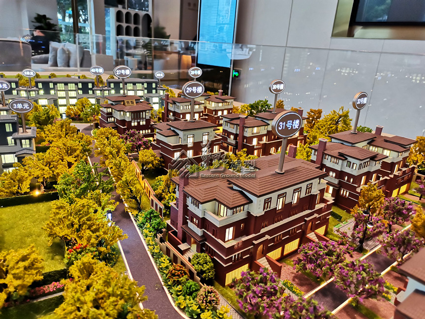 建筑: 沙盘建筑采用暖色灯光制作,楼栋号亮灯,二期建筑全部写实制作,一期采用水晶体制作。 景观:景观全部写实,铺装采用3D打印底部透光制作,马路用金属漆制作。草皮用3mm仿真草皮。 其他:区域采用黑色金属烤漆材质制作