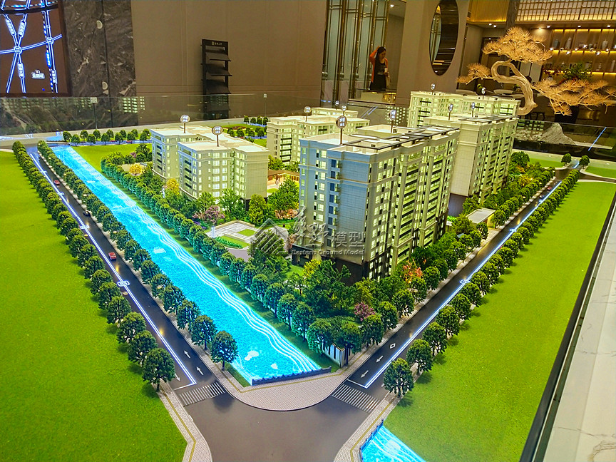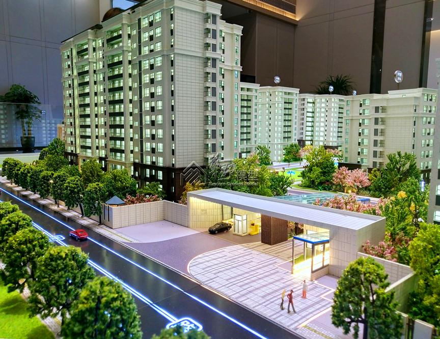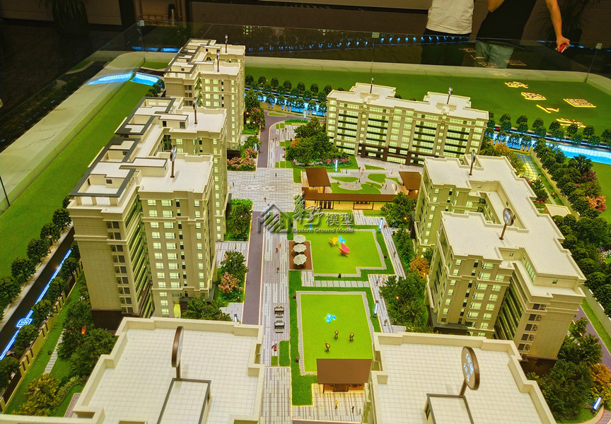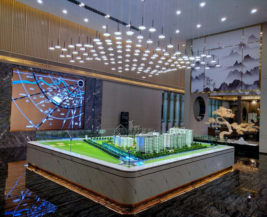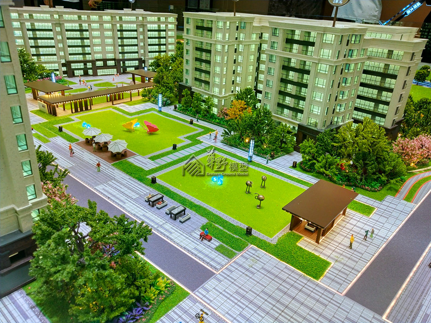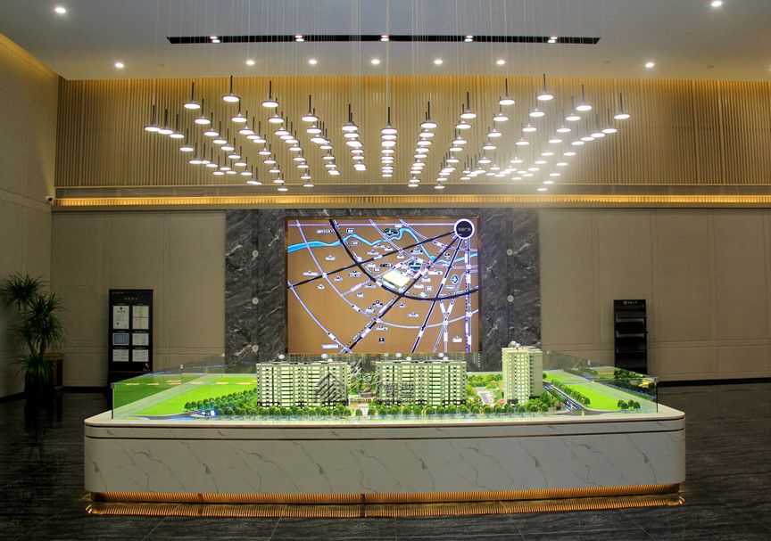 建筑全部写实制作, 沙盘建筑采用暖色灯光制作,楼栋号亮灯;景观全部写实,绿化风格秋色系,铺装采用3D打印底部透光制作,马路采用金属漆制作;区域采用拉丝仿铜材质