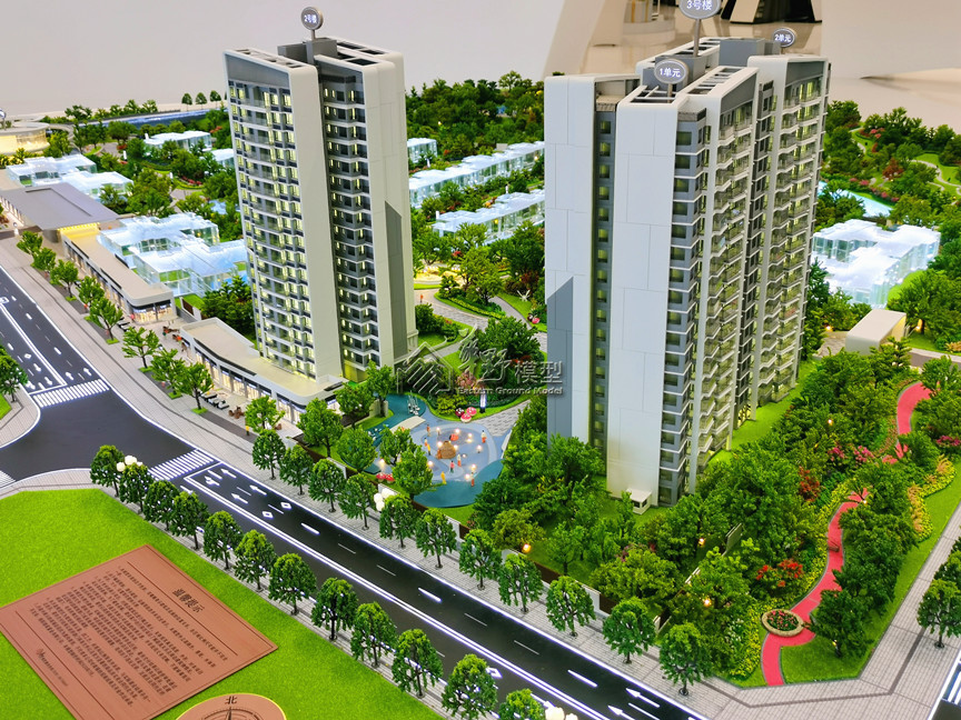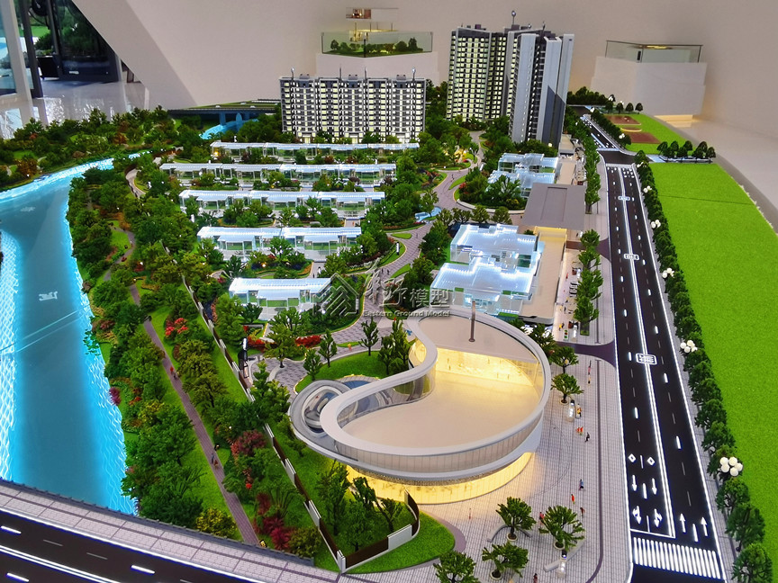建筑:建筑采用层层通体灯光,内贴银箔,1#、2#、3#、5#、6#合计12单元写实,其余采用透明水晶14个单元,水晶高度3-6cm,售楼部,门头写实制作; 景观:景观采用3D打印,景观草皮采用马毛制作,景观要求深绿,浅绿搭配素一点,不要太多花树,河流采用亚克力叠拼