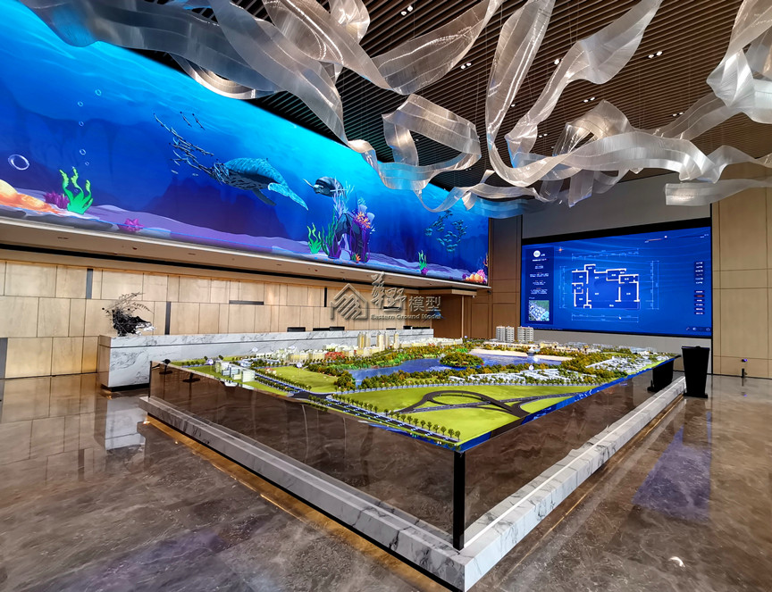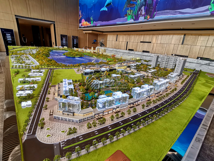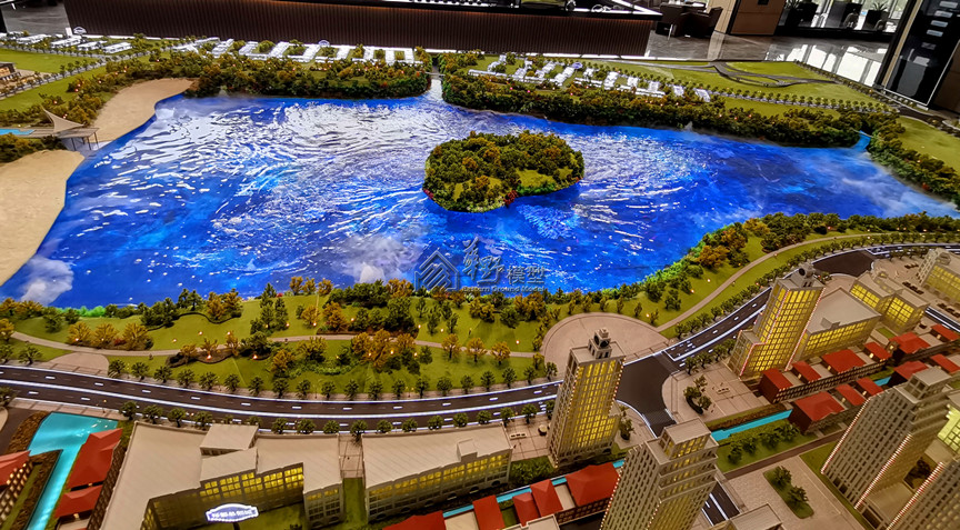 景观:写实制作定制夏秋色系树种,3D打印隐藏式灯光、园林景观及湿地公园局部点缀点状灯光,草皮采用新款马毛,雕塑、精神堡垒采用3D打印制作,项目本案建筑(1期、2期)定制一套水晶。造型刻线,配套:裕都总部城及配套政府公建采用写实制作,配套住宅地块采用水晶模拟,展示中心:写实制作定制明黄色灯光。金西湖水系:金西湖水系。采用底部P1.98LED屏+真水造浪+60秒3维动画。制作包括支撑架、屏、动画、防水系统、造浪系统、净化系统。沙盘智能操控系统:突破以往单一的操控模式,此次模型采用iPad控制沙盘灯光,显示界面内模型的控制点位清晰明了,点触界面点位物理沙盘灯光亮。