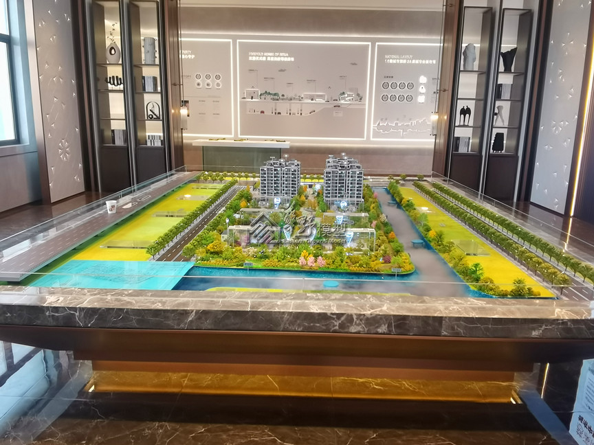 沙盘采用写实制作,灯光冷色系万家灯火展示,马路采用金属漆制作,水系动态真水全透光制作,整体沙盘采用真皮马毛铺设。