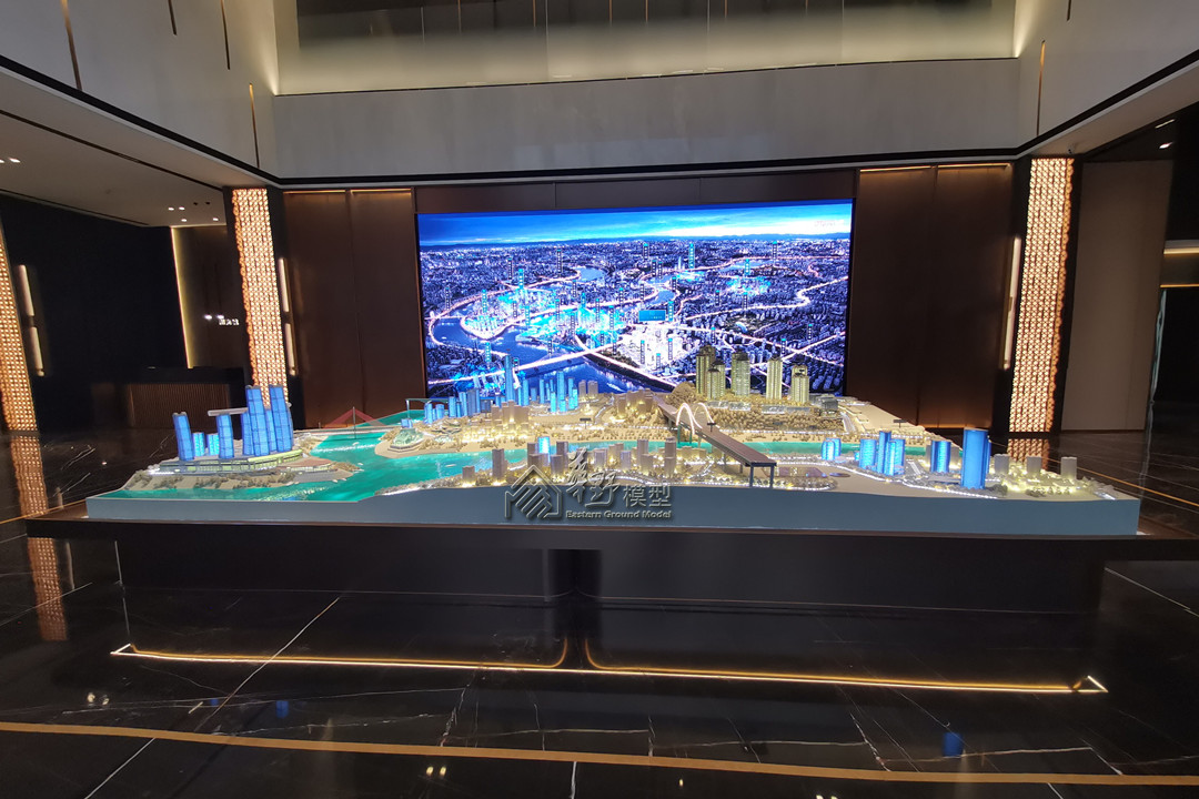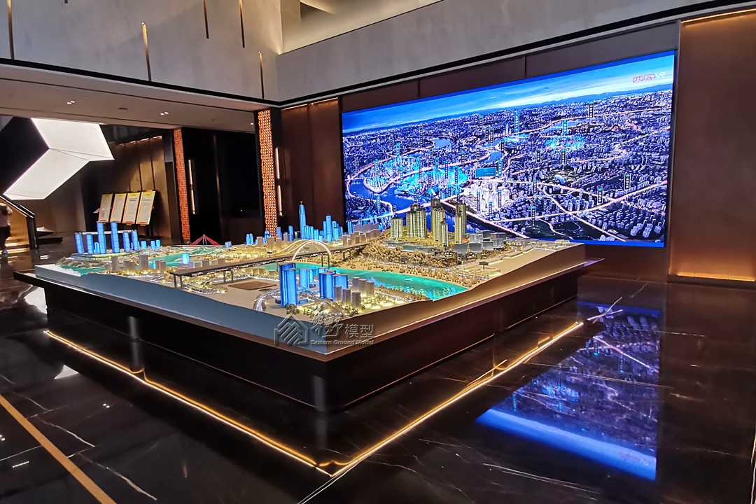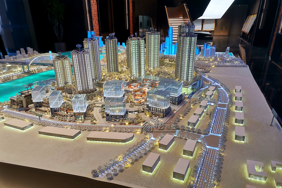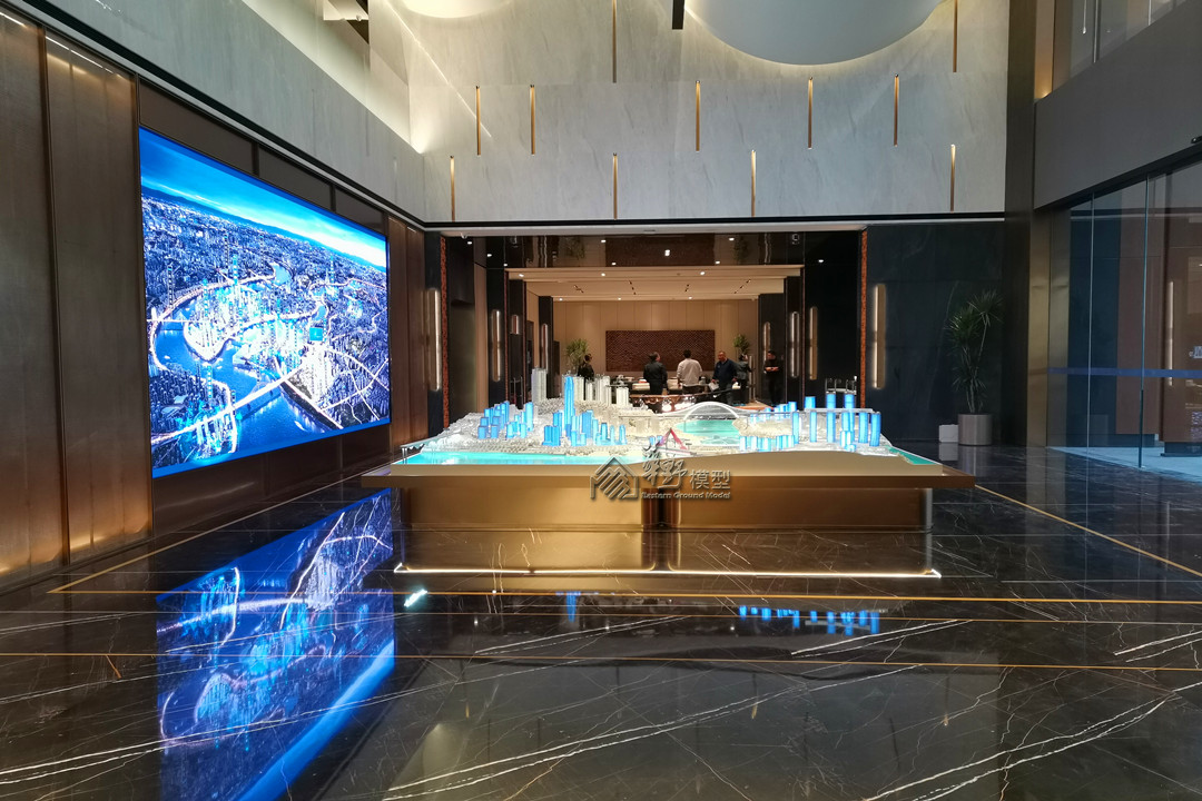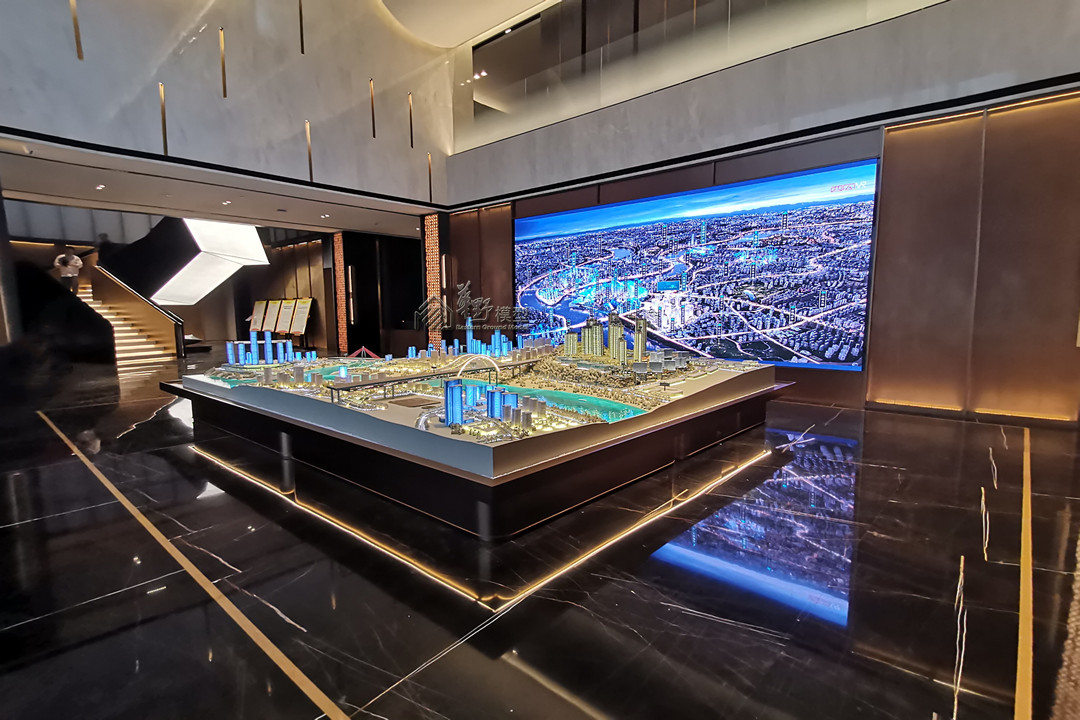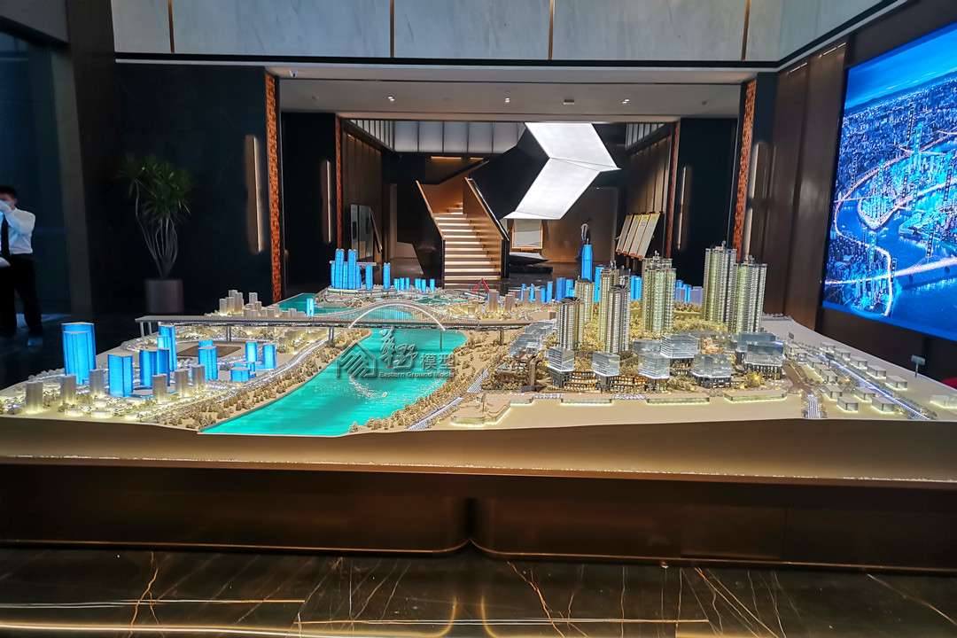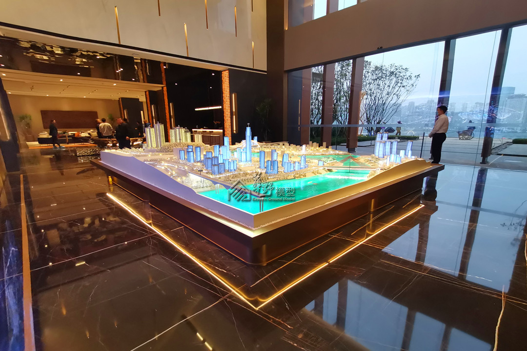 项目沙盘本案建筑写实,周边建筑半写实制作。景观艺术体现,江面采用夹层仿真玻璃制作 。