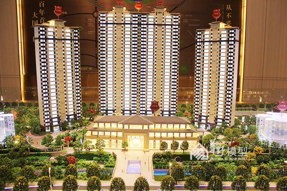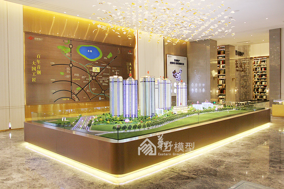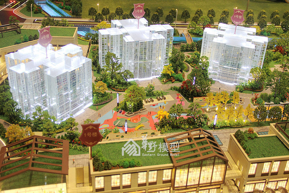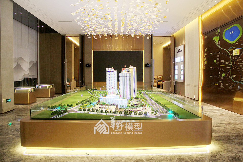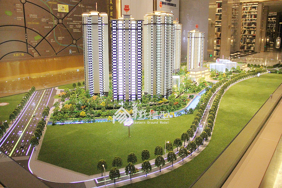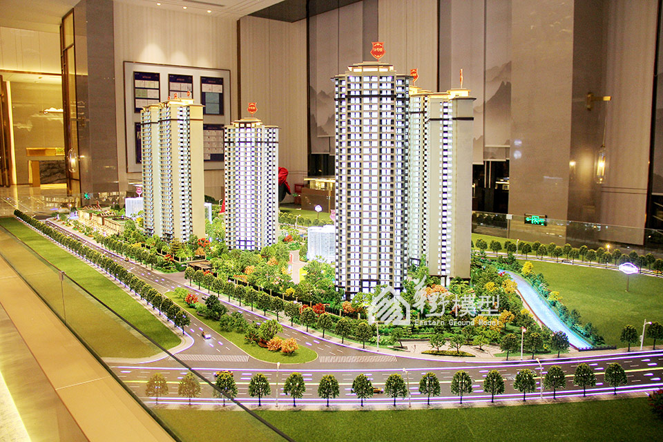 项目位于四川成都,北边临近3000多亩的北湖公园,临近主干道,交通便利,住宅沙盘里面包含了住宅楼盘和商业业态,写实打造住宅区半围式布局,有利于自然采光,各色小品摆放整齐,沙盘内用暖色灯营造出温馨之感。
