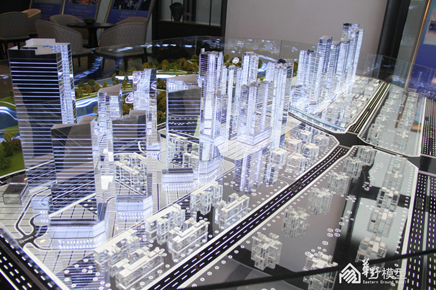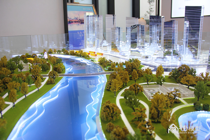 景观:铺装及绿化采用镜面材质背刻、底部透光。道路采用黑色亚克力制作,河流水面采用镜面材料叠等高线制作,等高线侧面透白色光,小水面采用小水钻透白光制作。铺装及绿化采用镜面材质背刻、底部