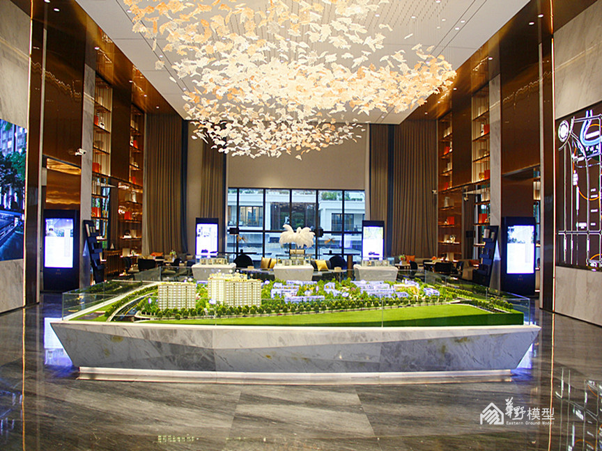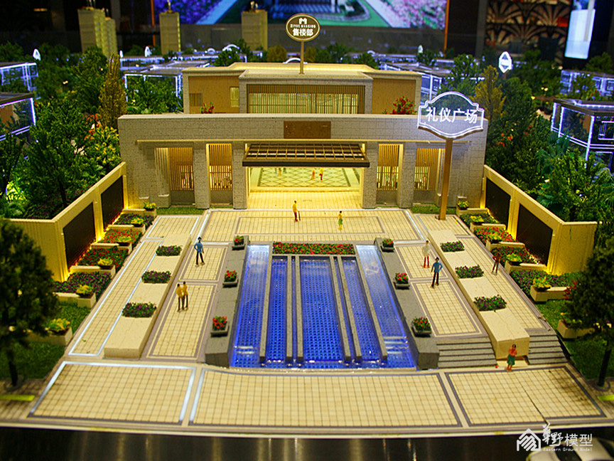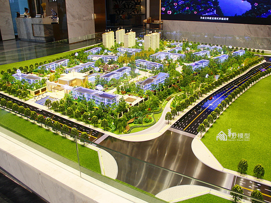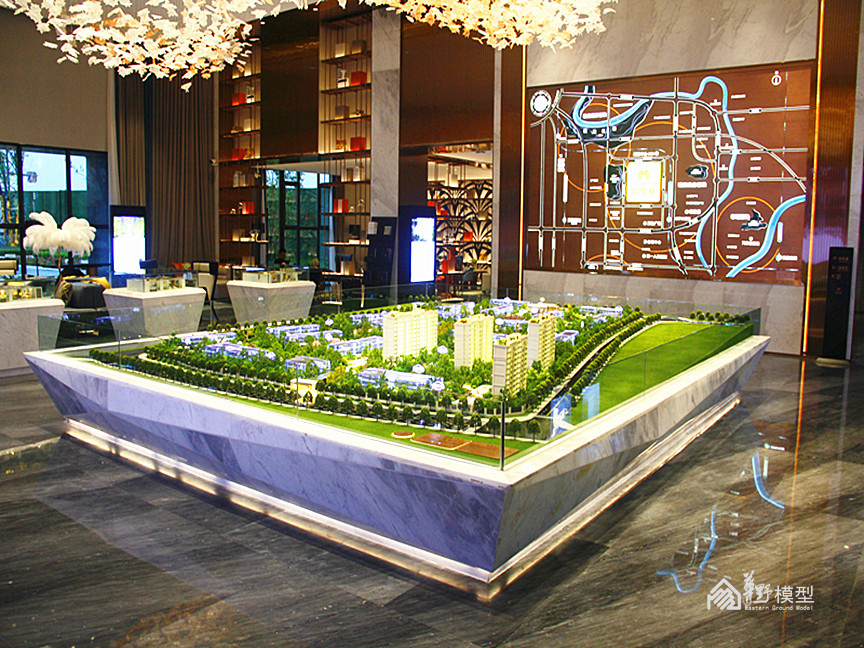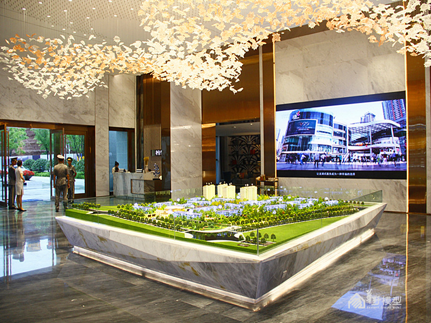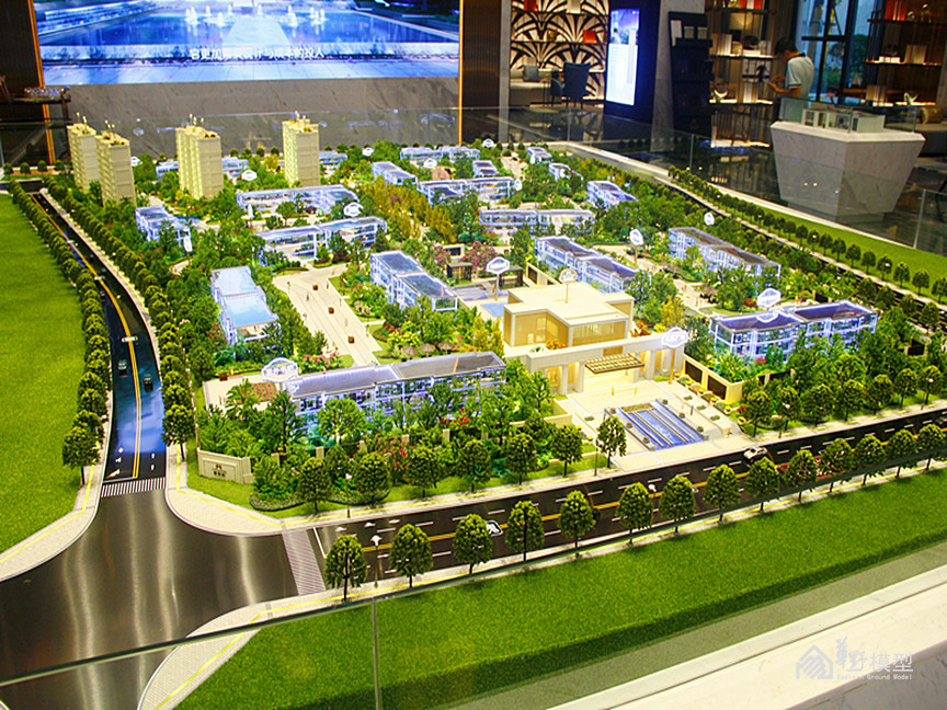 建筑:建筑采用全部写实制作,另住宅增加镜面体块一套,镜面体块双层灯光加镜面玻璃透光3层工艺。高度6-10公分。镀膜玻璃层板暖色整体亮灯效果内贴银箔,顶部轮廓灯,入户大门灯光衬托,楼牌亮灯制作。镜面体块双层灯光加镜面玻璃透光。