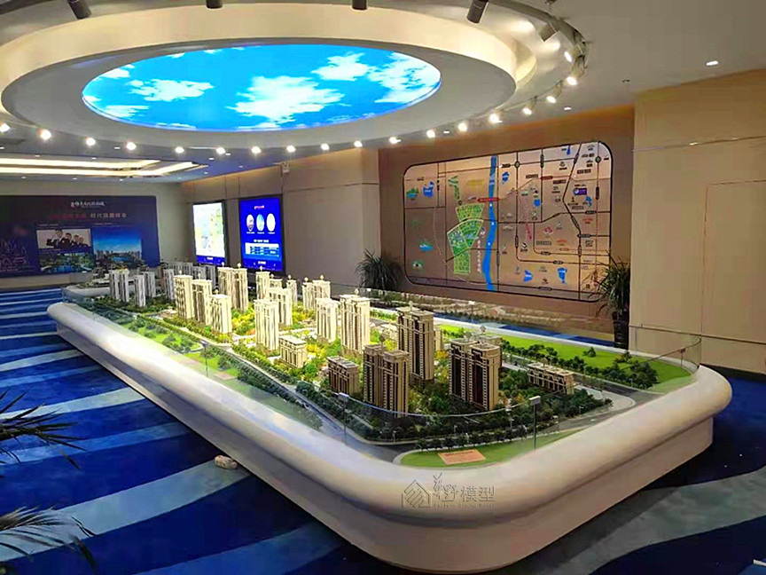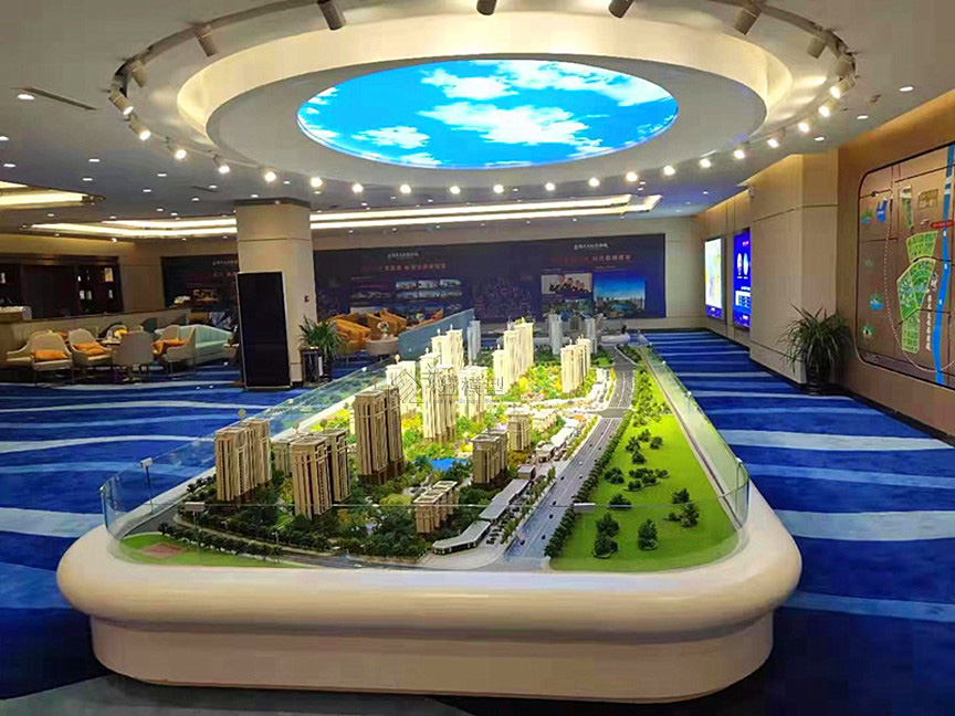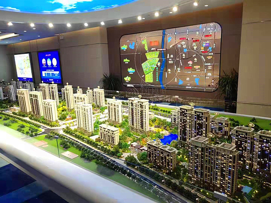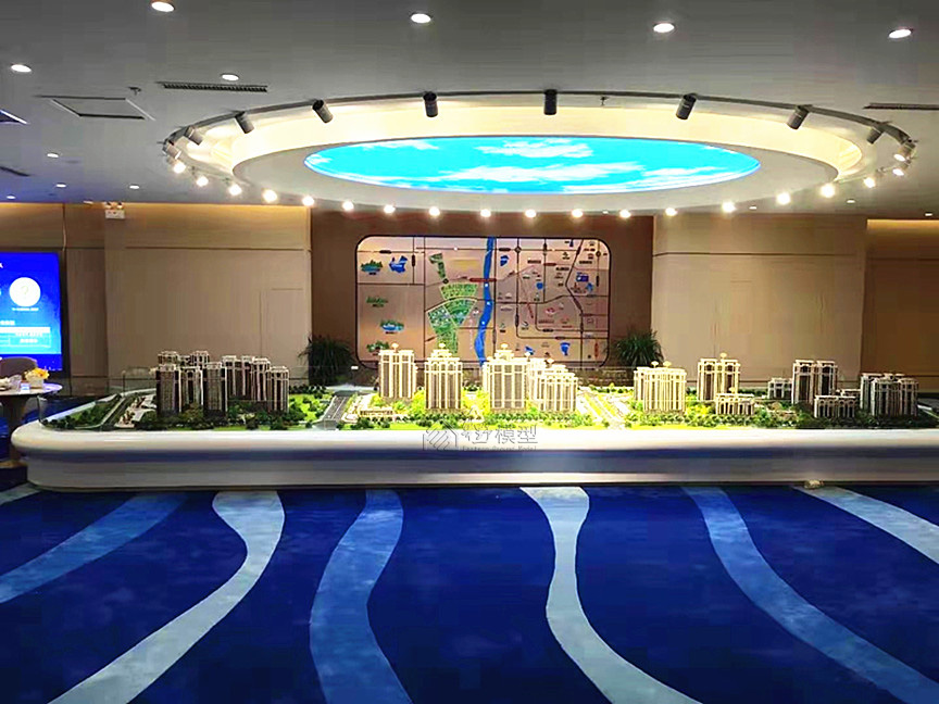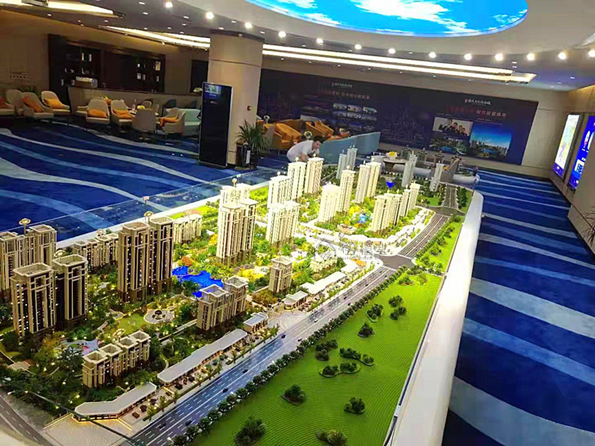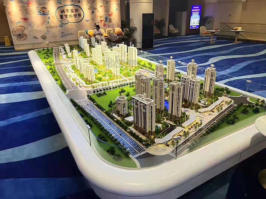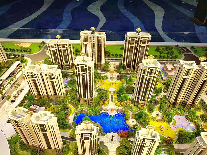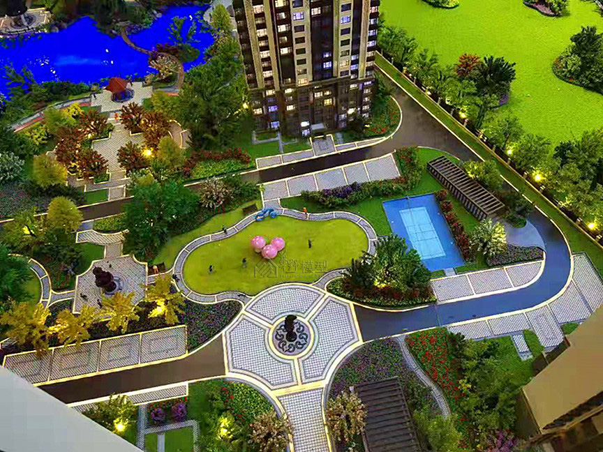 :恒大文化旅游城,水世界住宅沙盘,整体少景观部分采用仿真搞植物制作,建筑采用冷暖变换的灯光,建筑采用金属油漆上色。