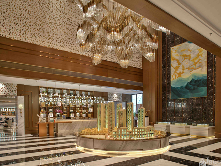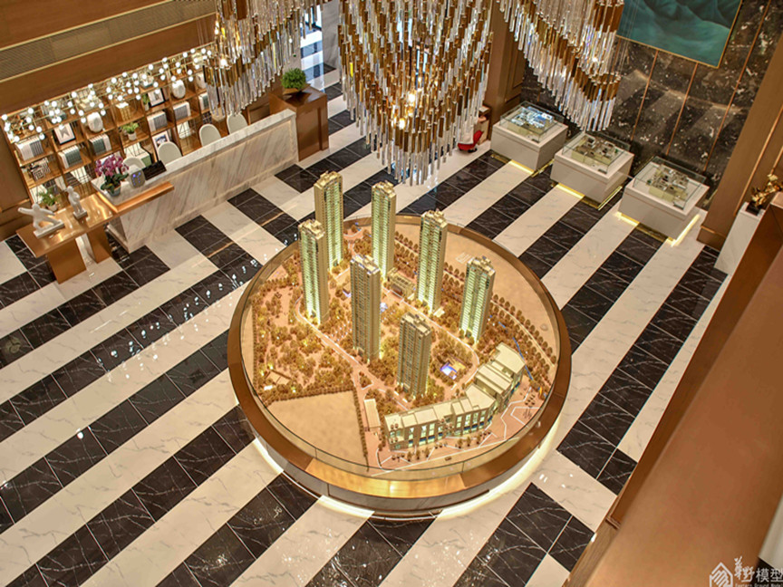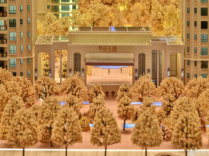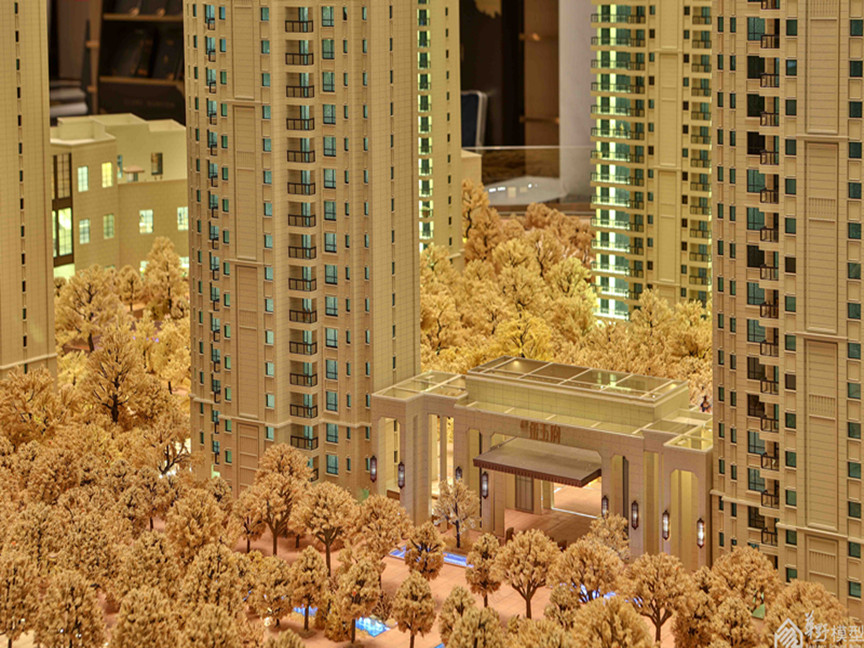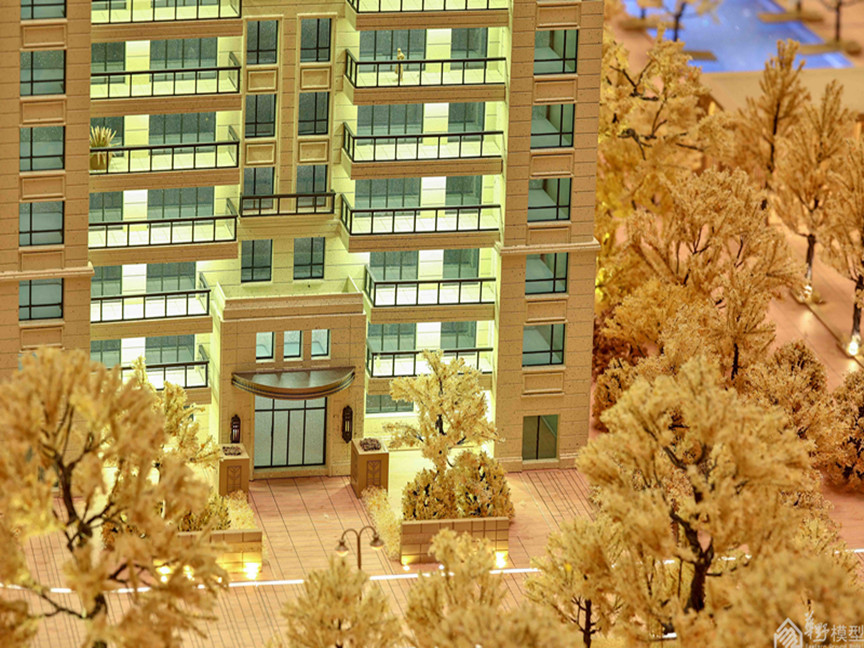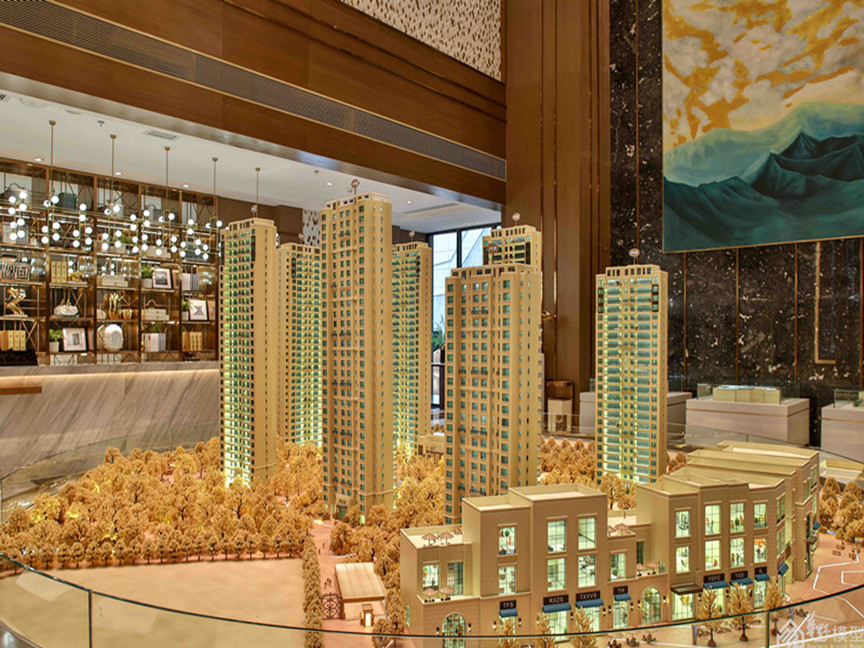 建筑:全写实制作,分格式万家灯火,灯光亮的户数达80%-85%,大阳台制作灯光,顶部制作洗墙灯,内贴银箔纸,整体亮灯;建筑楼牌号亚克力透光,部分房间布置内部生活场景,阳台点缀花草,窗户玻璃及栏杆玻璃采用镀膜玻璃制作;小区门头加宽加高。建筑适当缩小,做出大都会建筑风格。前广场部分商业打造高端奢华会所氛围,其他商业部分打造街区商业。