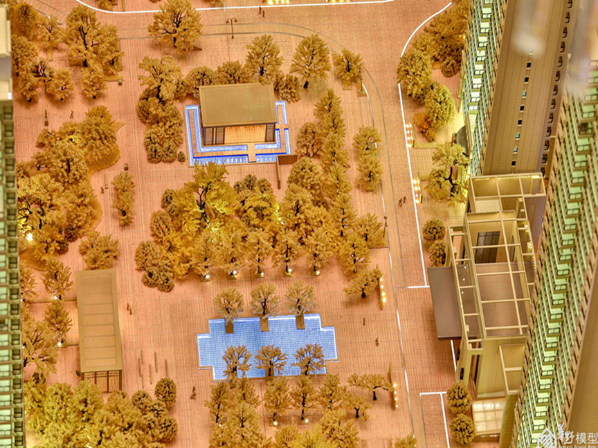 景观:铺装全部采用3D打印制作,道路咖色不锈钢拉丝腐蚀制作,道路边缘地块抬高3mm制作道路边缘灯光,铺装广场道路及采用木色系效果进行制作,道路两边边缘透光,环形跑道颜色加深,两边边缘制作跑动灯光。绿化采用黄色系效果体现。水系适当拉宽采用仿真水制作,底部制作动态灯光。周边围墙取消,选用树木代替,边缘采用层次组团绿化进行弱化。