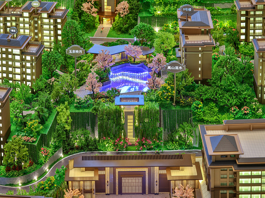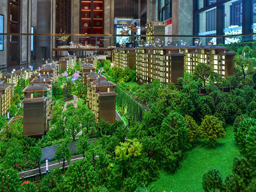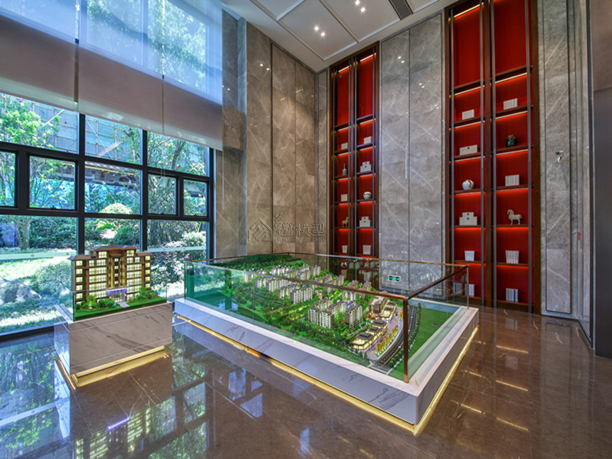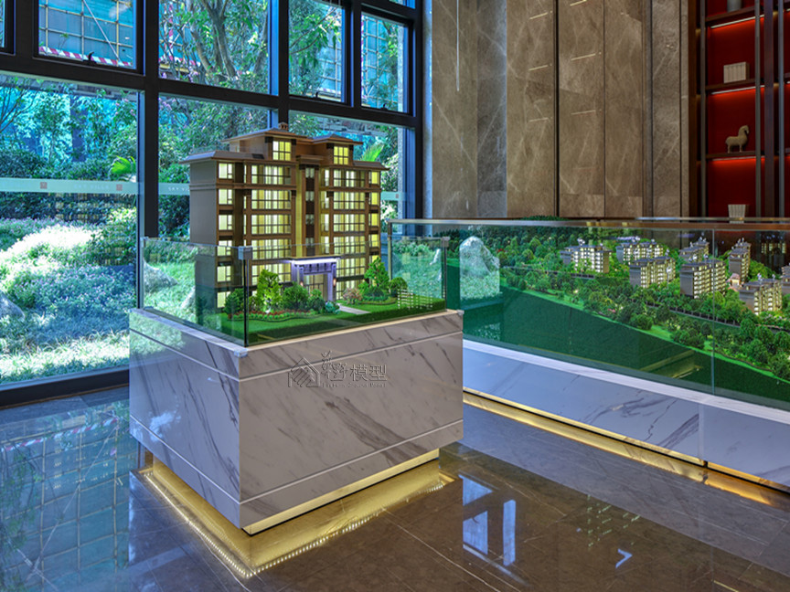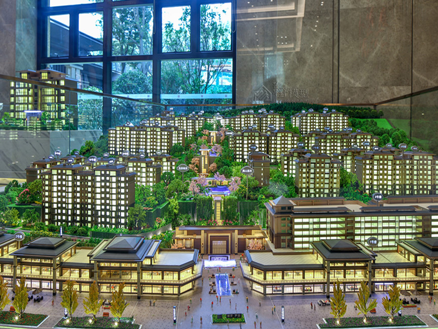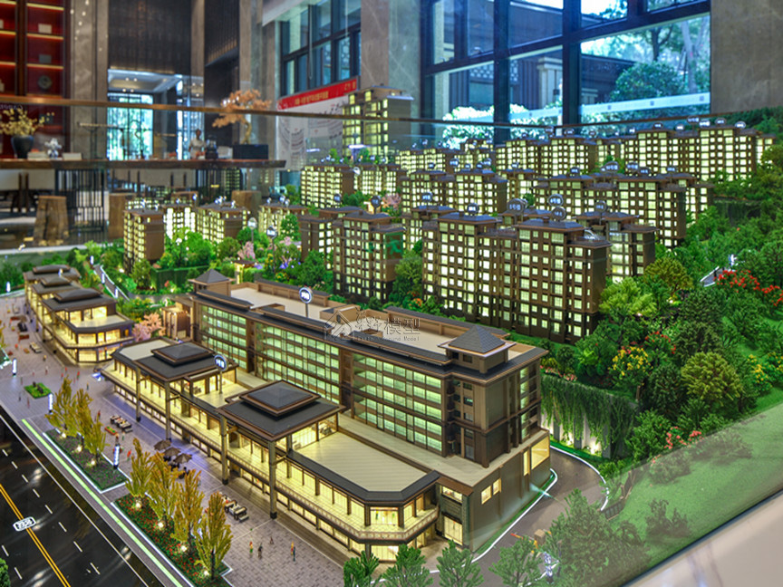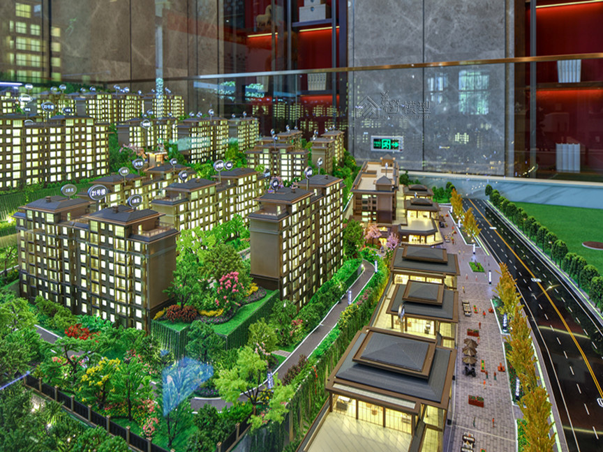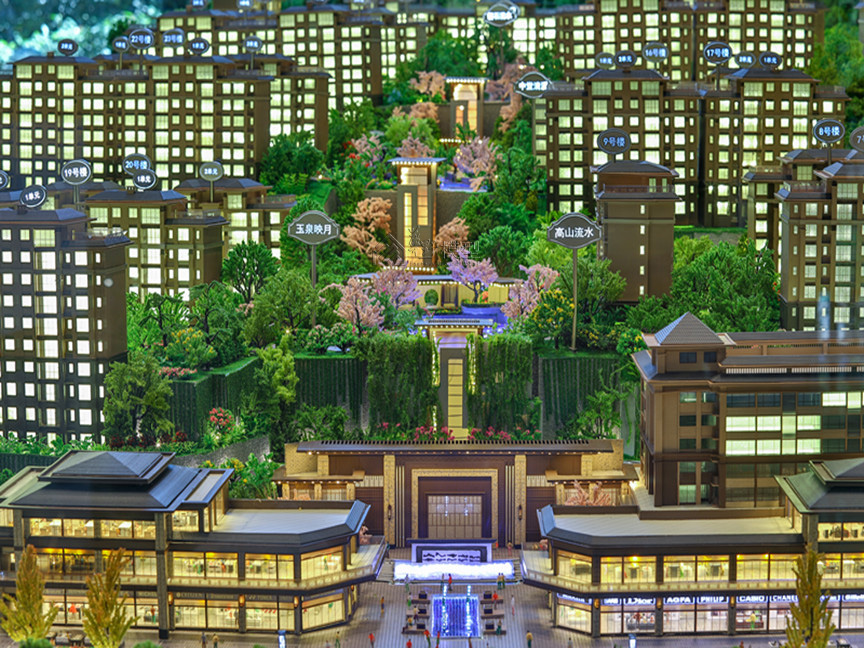 建筑:建筑全写实,住宅建筑液晶磨砂玻璃整体透光表现、公寓大方格跳动灯光,商业:层层灯板制作,刻画内部业态 景观:3D打印隐藏式灯光,凸显项目地形山体,丰富临近项目山体位置绿化 底座:采用人造石材直角造型,底部透光