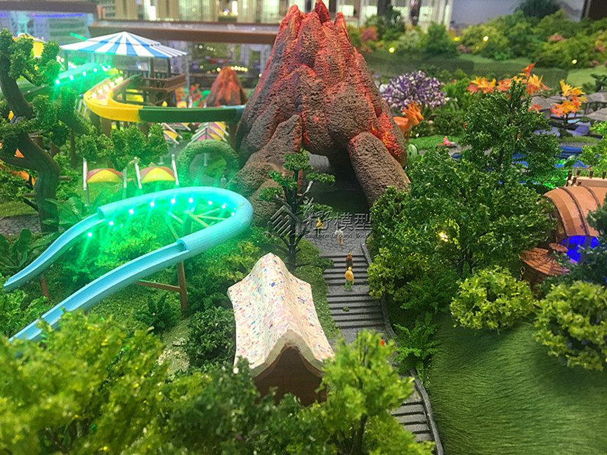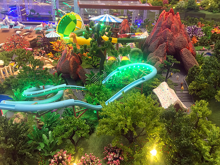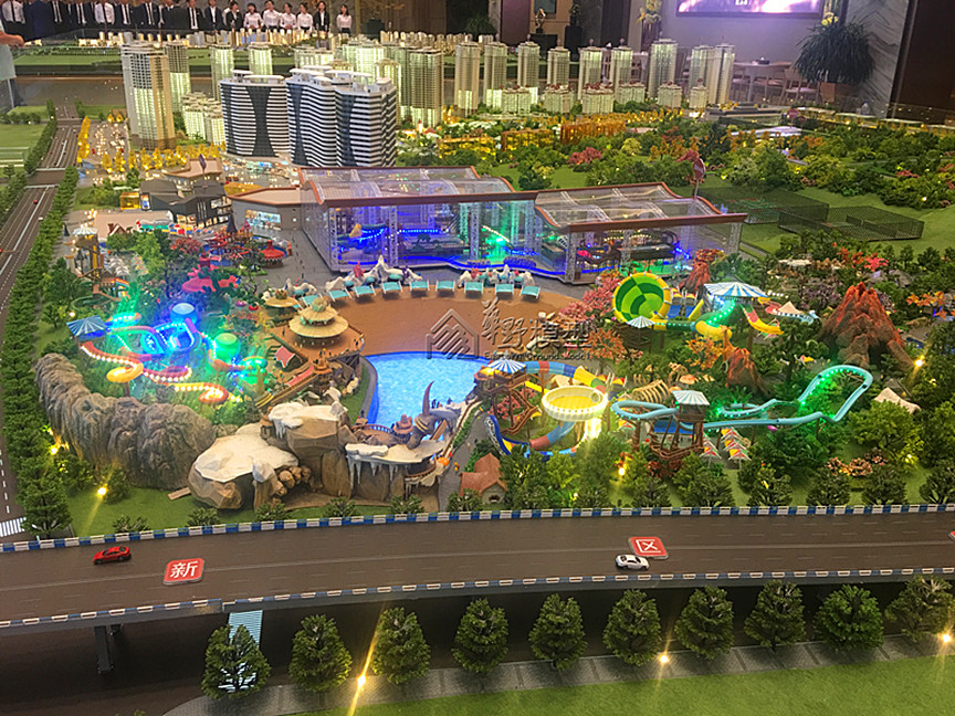 项目简介:1、项目沙盘本案、景观全写实表现,周边地块景观写实,建筑水晶体体现,水公园室外水景采用真水雾化效果,室内水景灯光水体现。