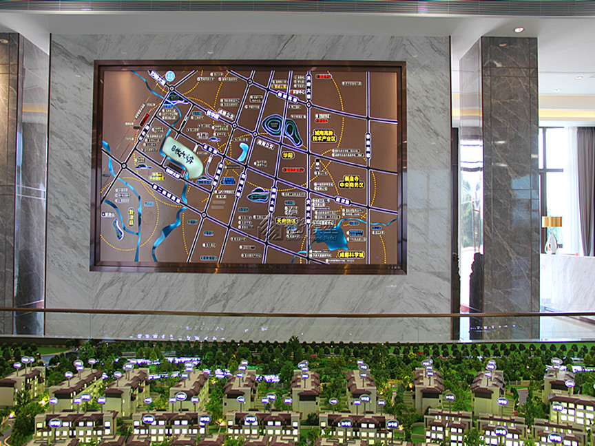 区域:采用拉丝铝板透光效果制作,山体透光,动态灯光,河流动态灯光。地铁、高铁动态灯光。
