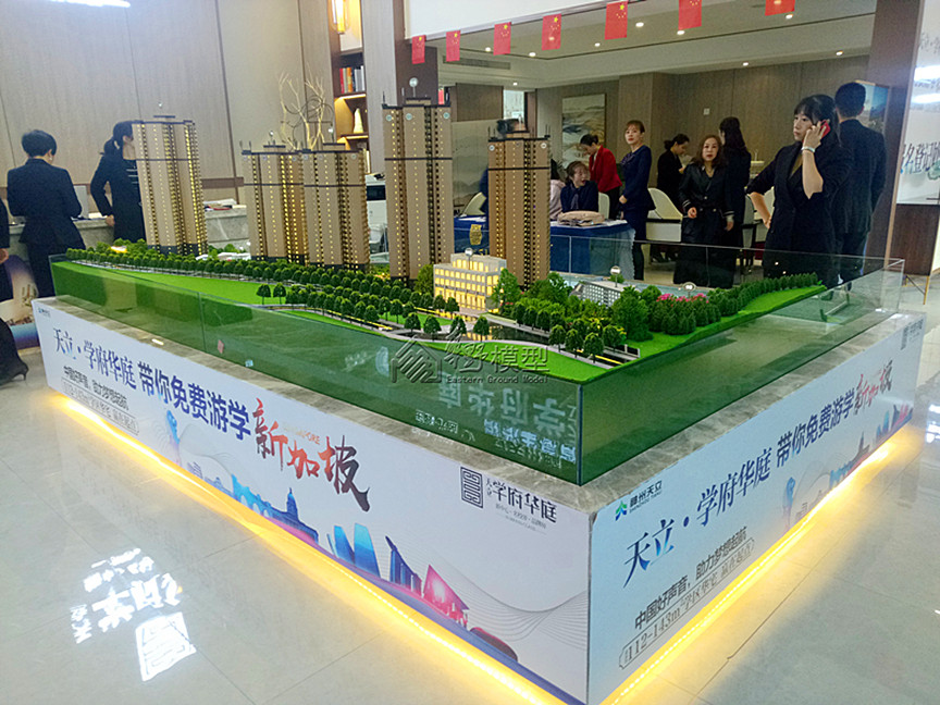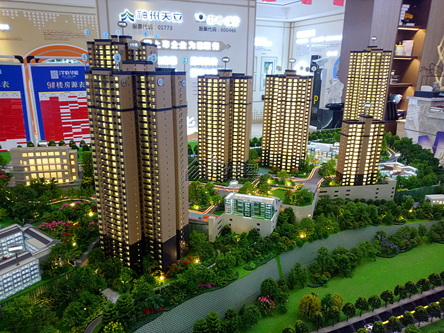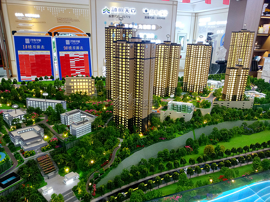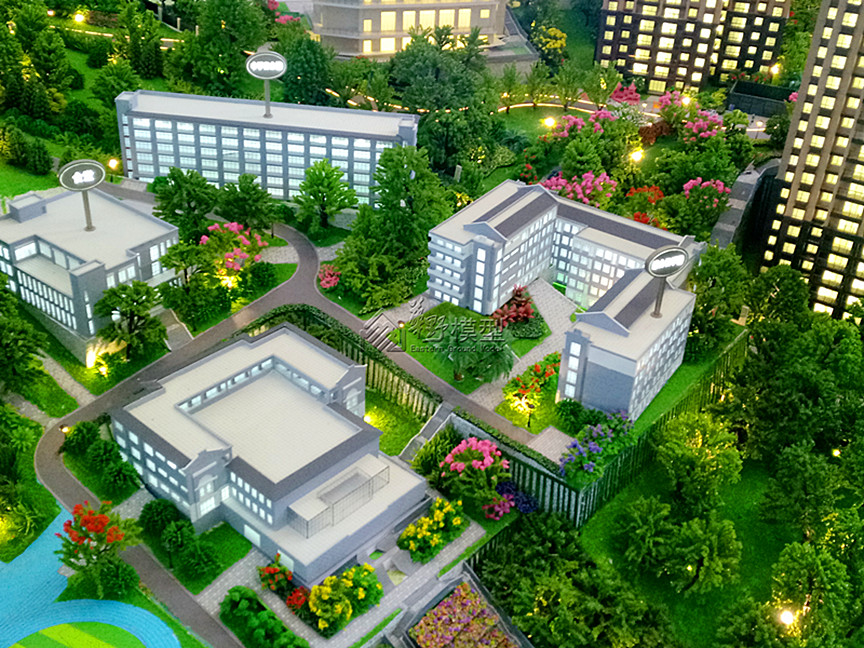 建筑:1.采用暖色灯光液晶镀膜整体透光。2.镀膜玻璃三维影像体块底部透光。3.字牌透光。户型顶部透光。4.门头打灯光。学校写实制作。住宅5个单元写实其它采用镀膜玻璃三维影像体块玻璃内部打灯光效果。 景观:1.环境底部透光。慢跑道灯光跑动。2.铺装底部透光3.马路采用跑动灯光。铺装采用3D打印。景观2侧和中间拉宽。马路采用不锈钢制作。 区域:区域采用仿铜拉丝铝板字体透光 户型:3套平层,豪装。
