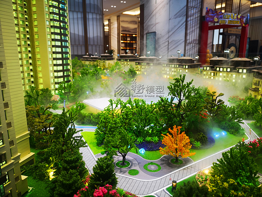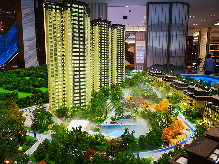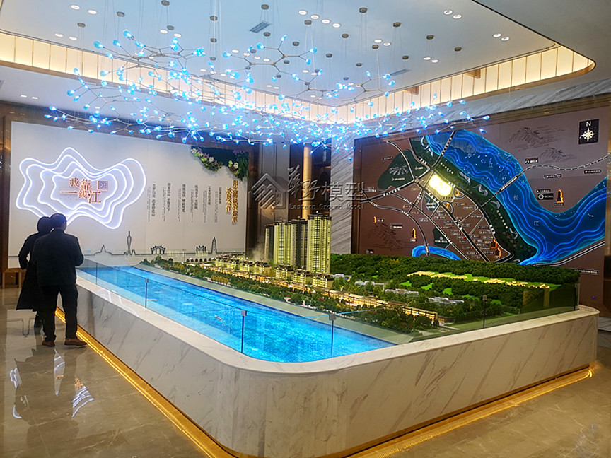 建筑: 采用暖白色灯光,整体通亮,建筑写实制作,做层板,别墅全部写实,商业全部写实制作,4栋(5#,6#,7#,8#)采用三维立体影像体块,体块高度约建筑三层(一套) 景观:景观全部写实, 铺装采用3D打印制作,周边道路采用不锈钢透灯光制作,长江采用真水雾化效果制作,园区内景观,游泳池采用雾化效果,高差江面与项目的高度进行弱化处理,紧密与项目衔接,马路采用采用不锈钢制作; 区位:区位打灯光,区位采用仿铜制作; 底座:采用人造大理石制作;