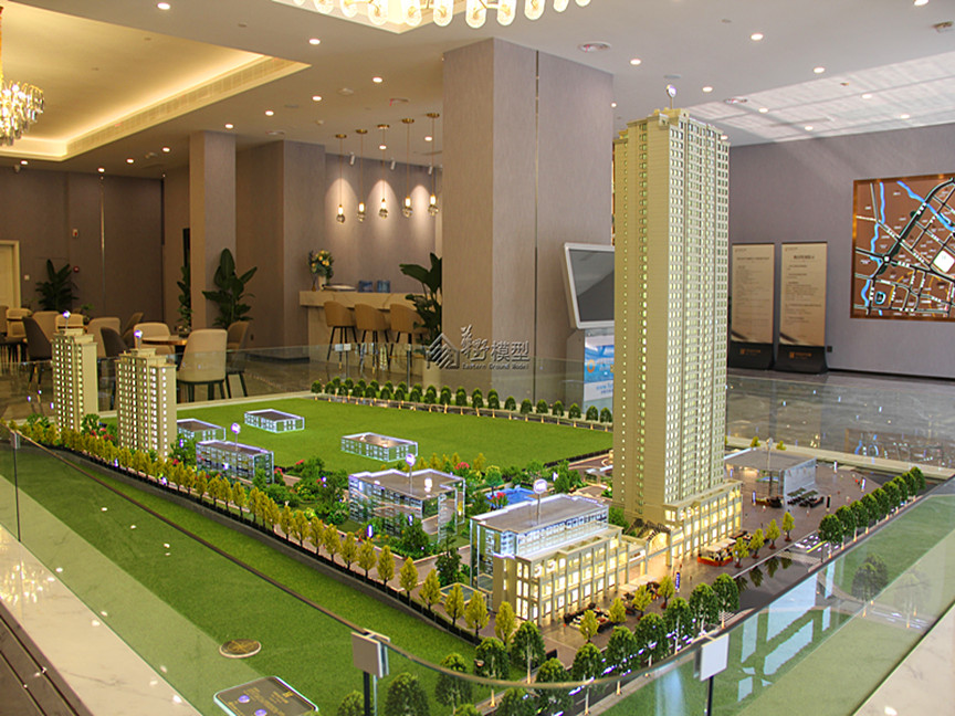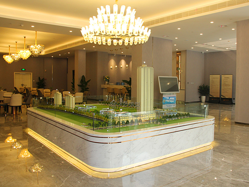 建筑:建筑部分写实制作(4号楼、5号楼、7号楼、6号楼2单元3单元、商业),体块采用3维镀膜立体镜面体块,道路外空地用体块丰富,住宅采用暖色系液晶整体灯光、液晶镀膜玻璃,酒店采用冷色系层层通体亮灯、内似银箔 景观:铺装全部采用3D打印制作,道路采用不锈钢道路透光表现,道路以外地块采用仿真草皮表现,建筑私家花园采用马毛打造。 区位:采用玫瑰金拉丝铝板制作,路网商圈亮光处理,本案3D立体凸显 底座:方形倒圆角,采用烤漆底座