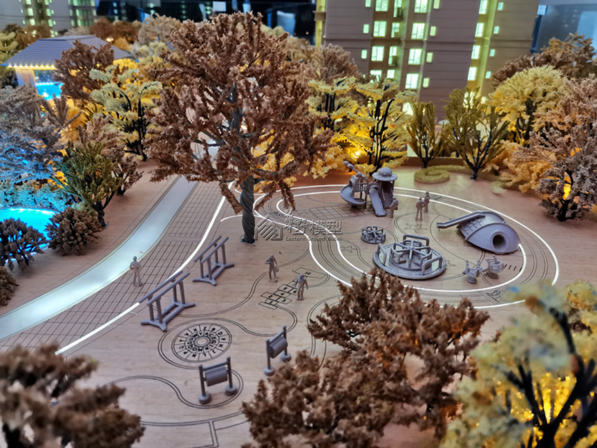 建筑:沙盘建筑建筑全部意向制作,喷木色漆,整体通透透光内部饰银箔纸, 景观:铺装采用3D打印环境底部透、马路采用跑动灯光金属漆制作、定制木色系小品、周边空地采用颜色相匹配绒布,大空地采用logo漏光 户型:豪装,套平层, 底座:采用烤漆类仿石材,装饰不锈钢线条、底部透光