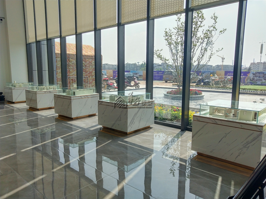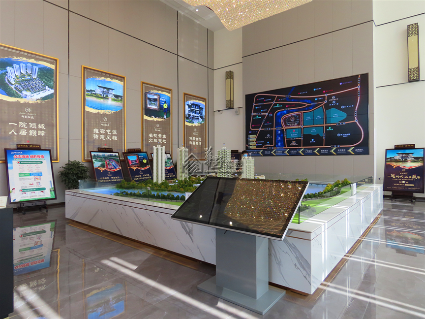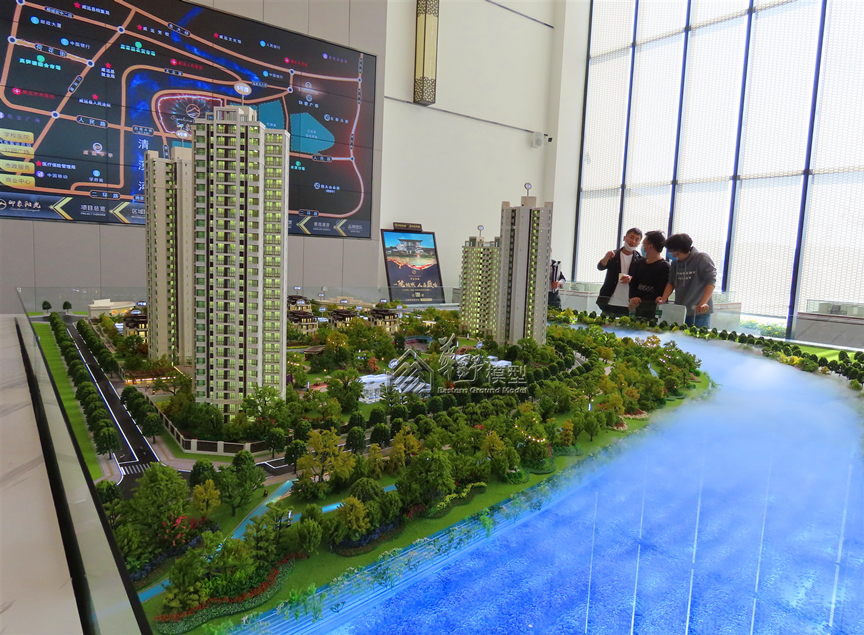 建筑:整体通透亮光内饰银箔效果 景观:采用3D打印,道路金属漆,公园雾化,真水雾化效果。 户型:5套豪装,外墙写实带灯光和电视,户型平面绿化