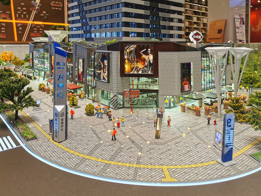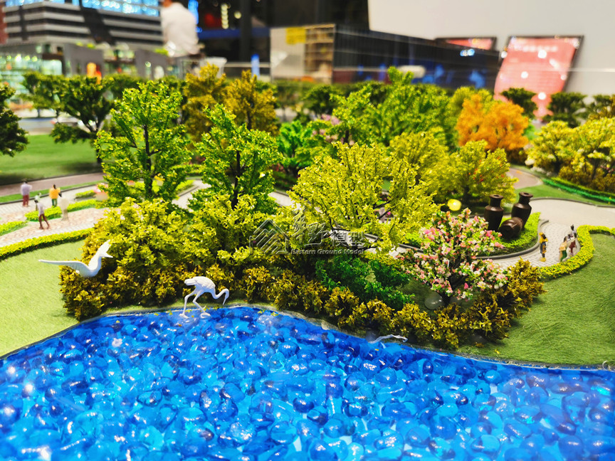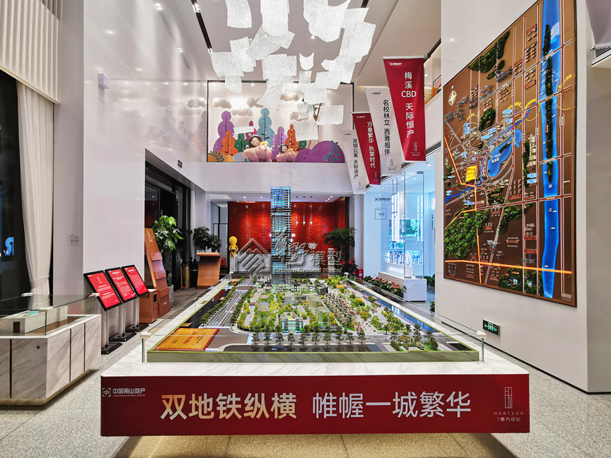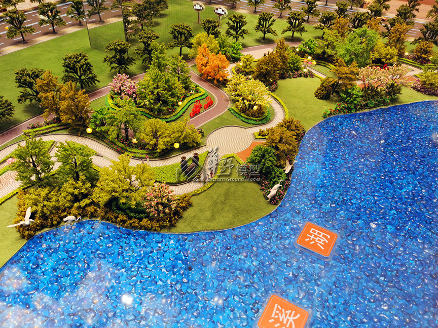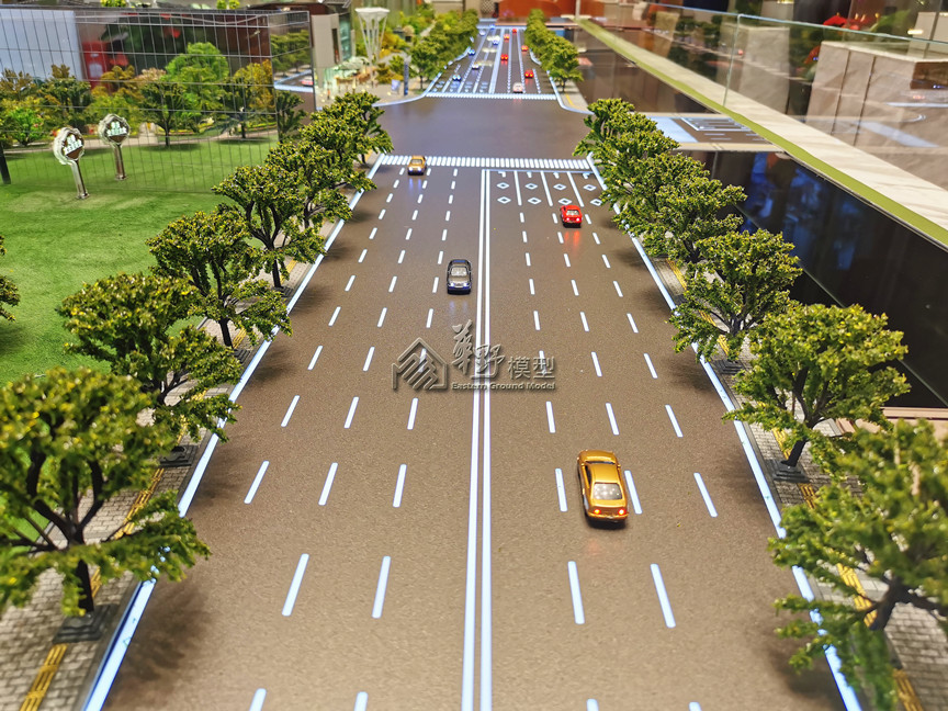 商墅、商业、公寓式酒店写实表现,商墅、商业采用暖色灯光,公寓式酒店采用冷色层板编程式跳跃灯光,四周做流线型灯光。住宅全部采用水晶体,水晶体底部透光表现。景观采用微缩写实,周边空地用黑色真玻璃表现,草地采用真马皮表现,景观铺砖采用UV打印,道路采用“氟碳漆”制作,行车线、斑马线设置灯光效果,并设置前后亮灯小汽车。梅溪湖采用仿蓝宝石效果,底部透光,湖岸景观丰富。