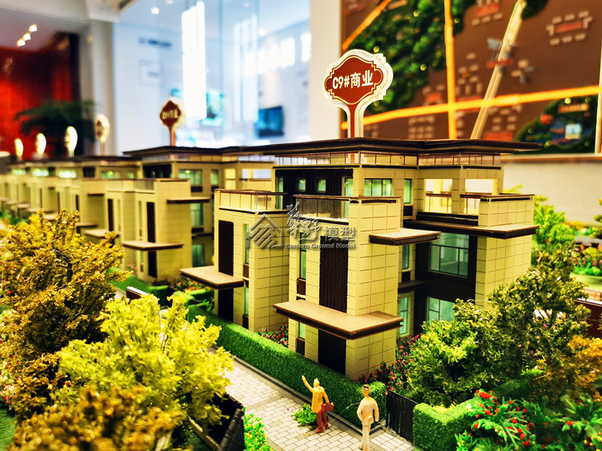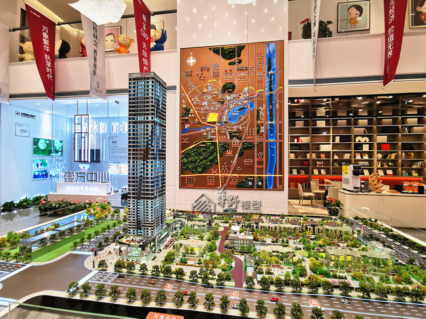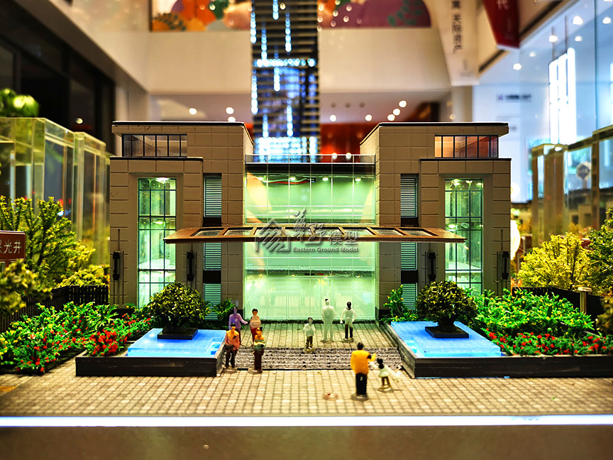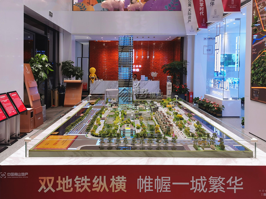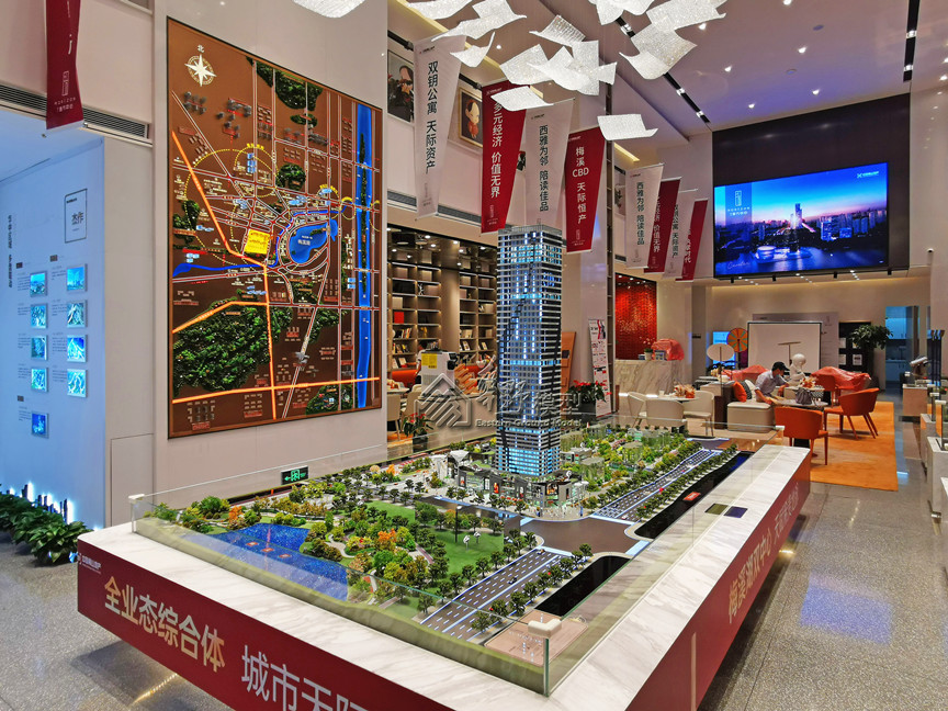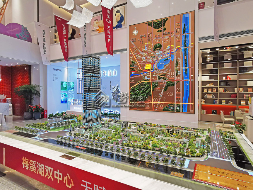 商墅、商业、公寓式酒店写实表现,商墅、商业采用暖色灯光,公寓式酒店采用冷色层板编程式跳跃灯光,四周做流线型灯光。住宅全部采用水晶体,水晶体底部透光表现。景观采用微缩写实,周边空地用黑色真玻璃表现,草地采用真马皮表现,景观铺砖采用UV打印,道路采用“氟碳漆”制作,行车线、斑马线设置灯光效果,并设置前后亮灯小汽车。梅溪湖采用仿蓝宝石效果,底部透光,湖岸景观丰富。