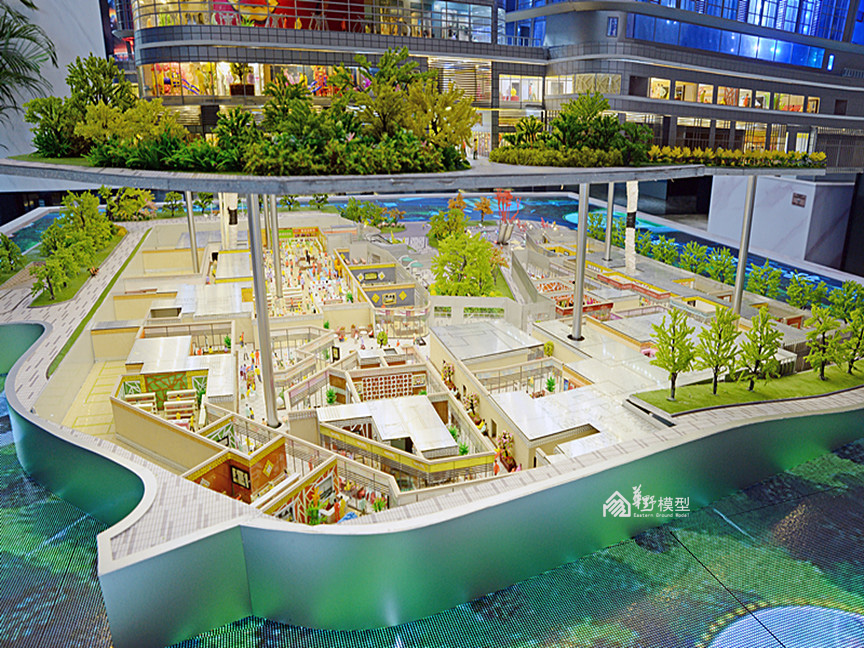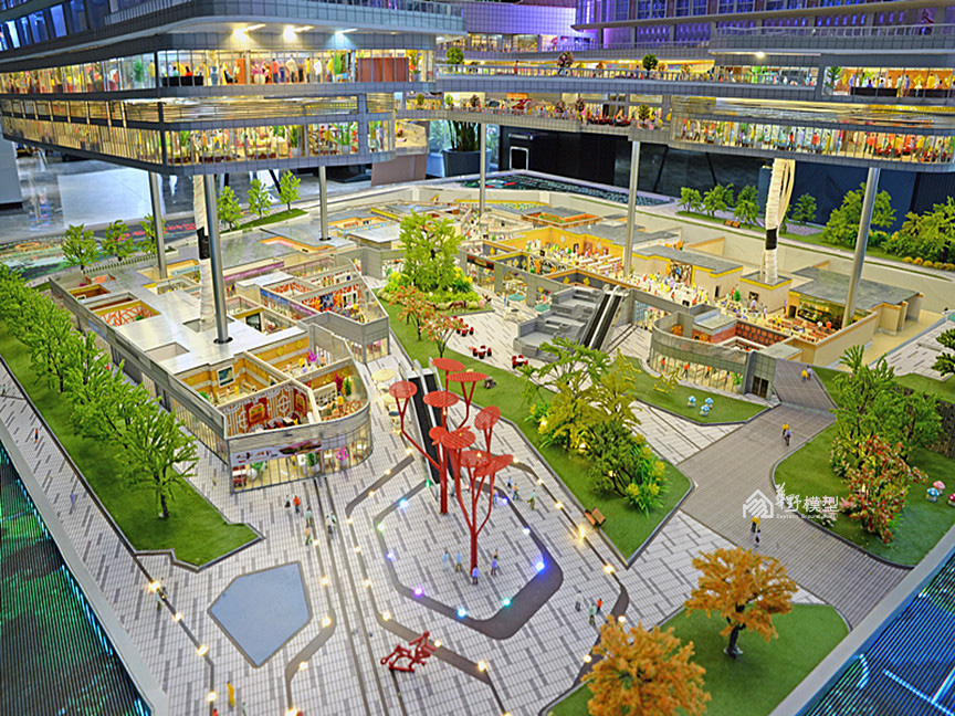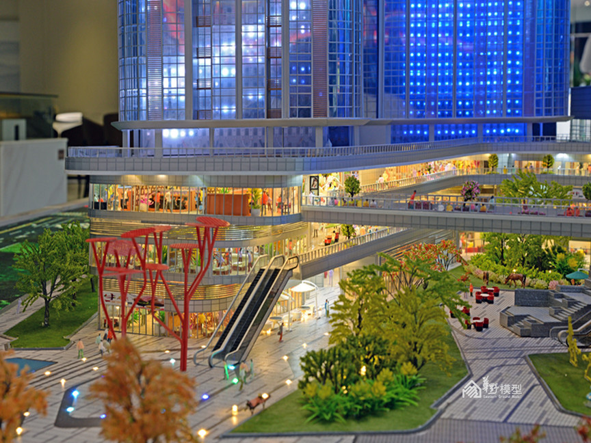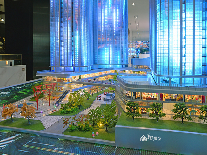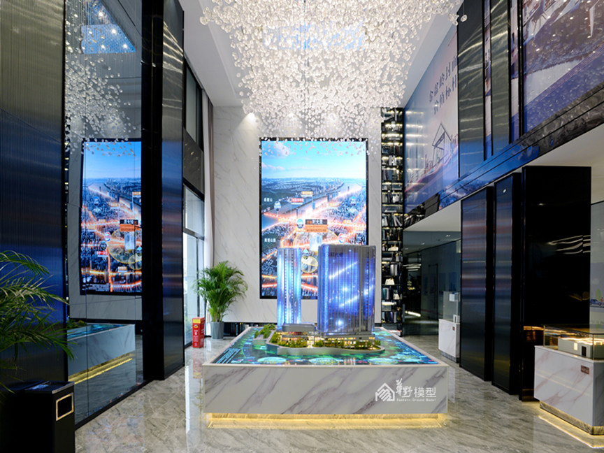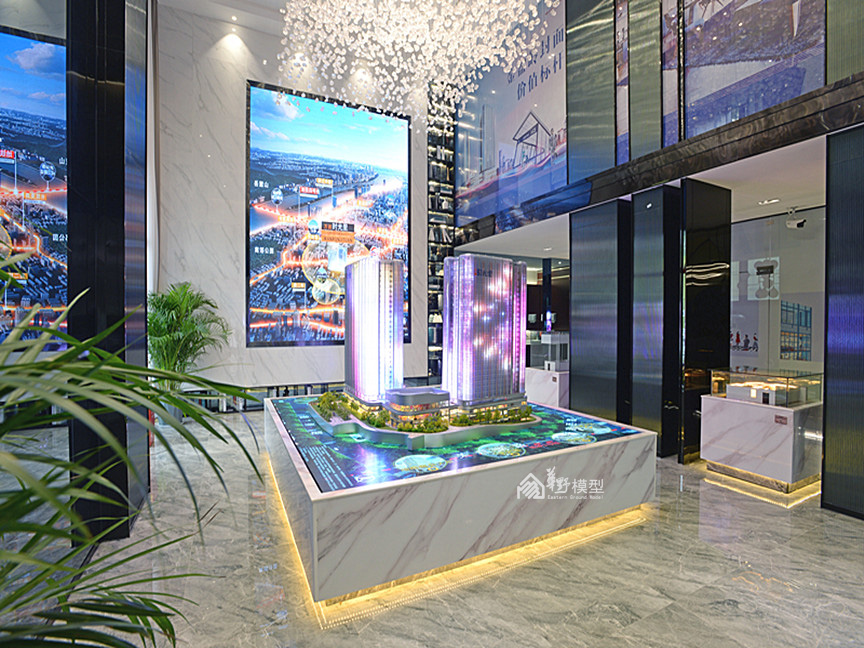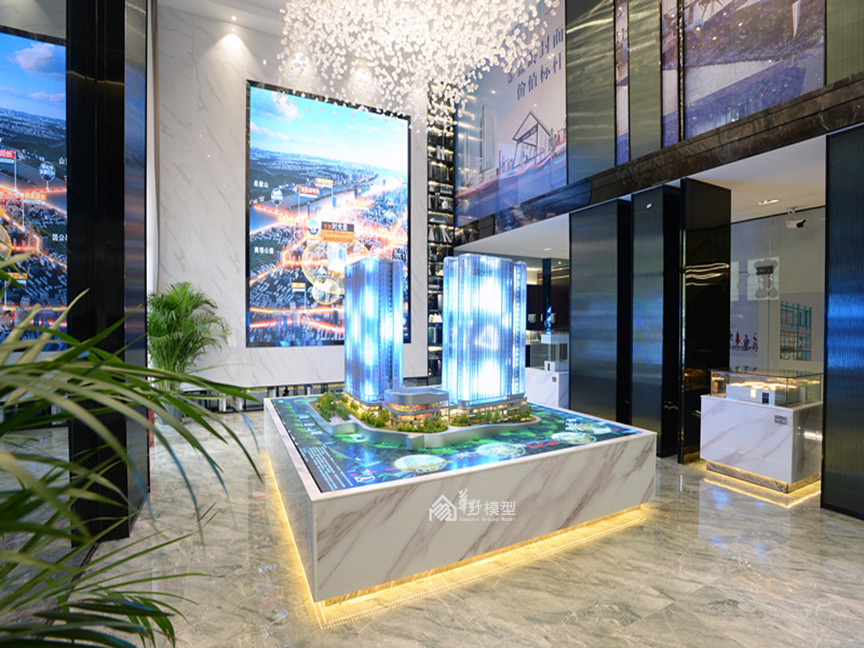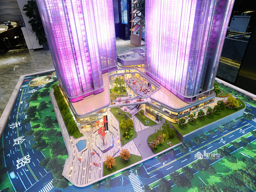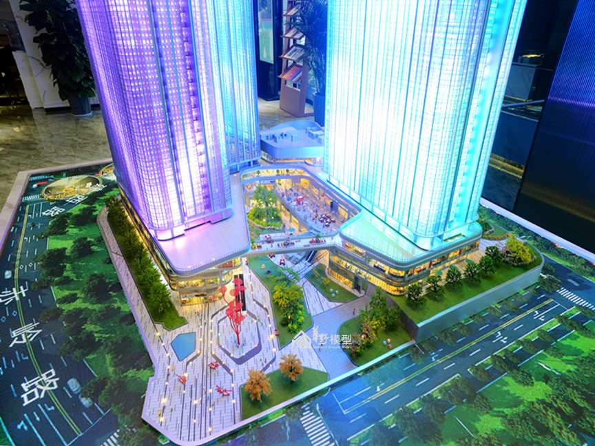 项目简介:沙盘为两栋L转角型高层公寓建筑组成,底部由商业相接,制作上采用机械升降系统,将负一层、一层商业以升降形式层层体现内部布局及业态,精心制作内部商业氛围。建筑采用ABS作为主结构,外立面以镀膜玻璃为主材,内部嵌入动画编程系统,循环展现七彩炫浪的动画及项目LOGO。采用LED屏动画的形式体现周边道路交通及配套设施,在设计上新颖独特,在投入上属于科技类型模型,从观赏的角度,动画的植入更加酷炫,搭配石材底座,底部暗藏暖色灯带,与建筑体的七彩灯光相互衬托,体现出高科技及独特的创意,引人注目。