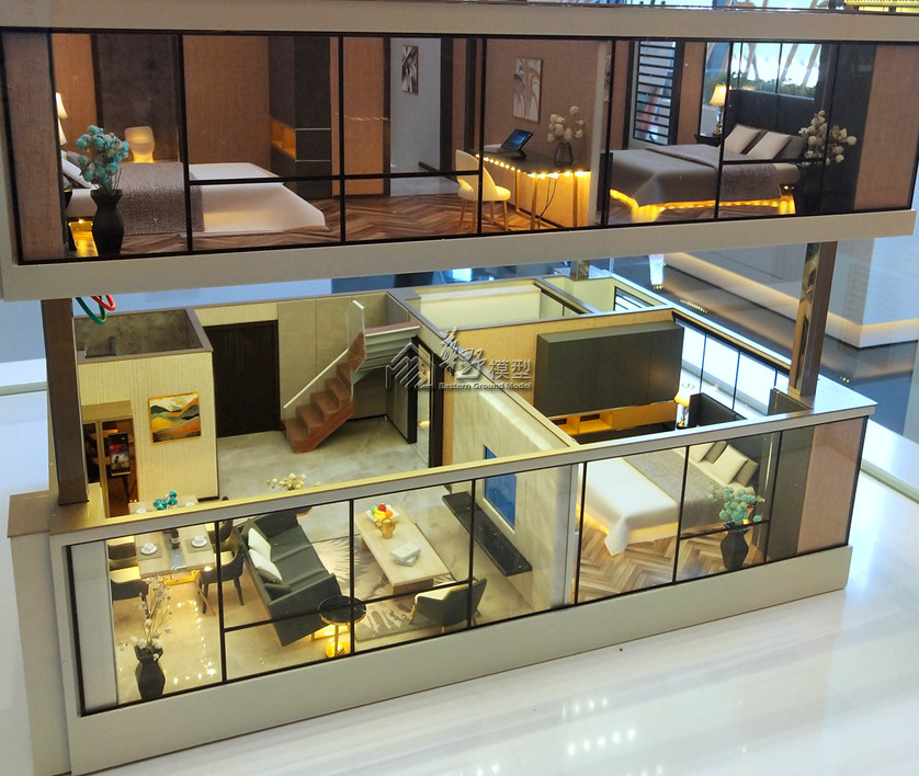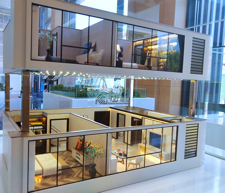 Loft户型:采用写实制作,定制标准(3套)。商墅单体采用选层升降每层展示(1套); 区位:采用拉丝铝板材质;