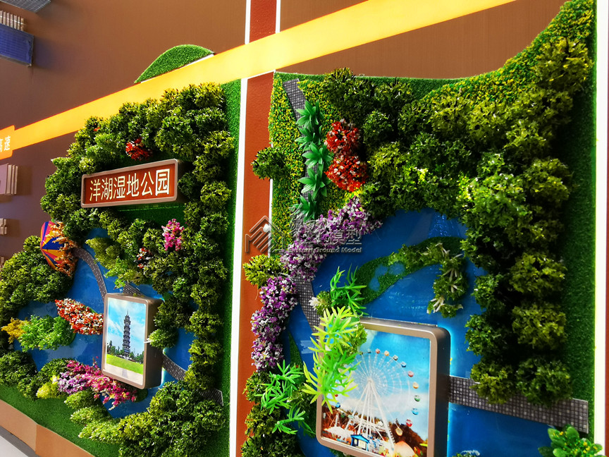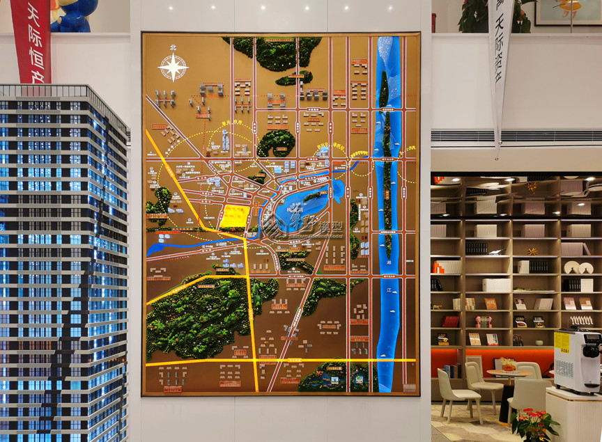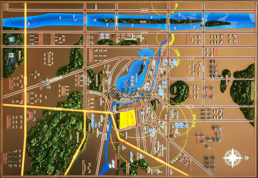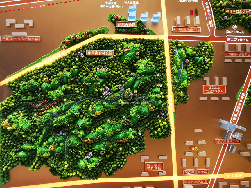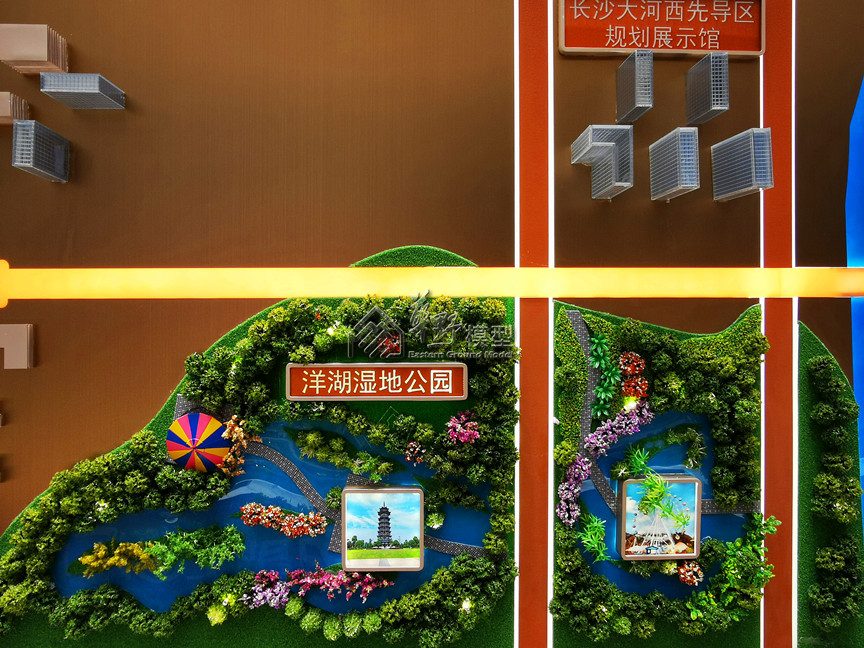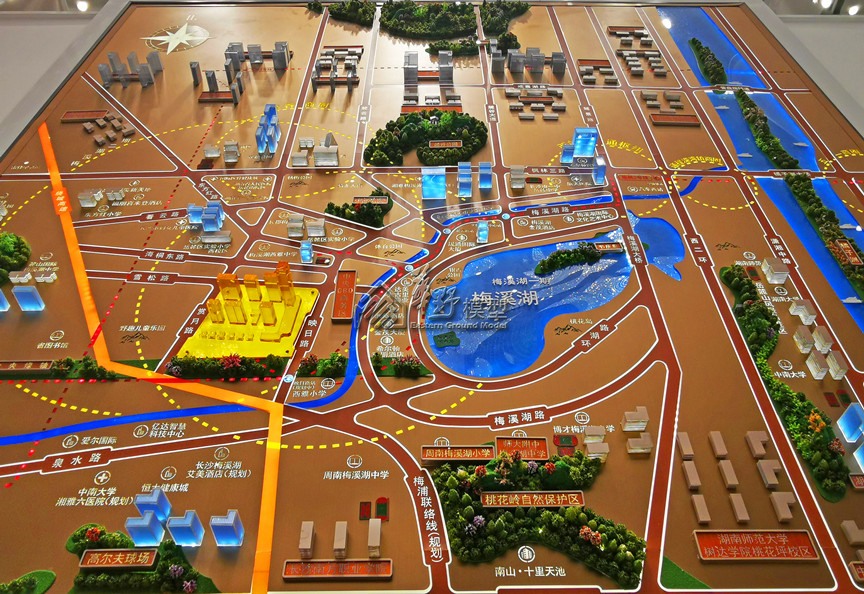 商墅、商业、公寓式酒店写实表现,商墅、商业采用暖色灯光,公寓式酒店采用冷色层板编程式跳跃灯光,四周做流线型灯光。住宅全部采用水晶体,水晶体底部透光表现。景观采用微缩写实,周边空地用黑色真玻璃表现,草地采用真马皮表现,景观铺砖采用UV打印,道路采用“氟碳漆”制作,行车线、斑马线设置灯光效果,并设置前后亮灯小汽车。梅溪湖采用仿蓝宝石效果,底部透光,湖岸景观丰富。