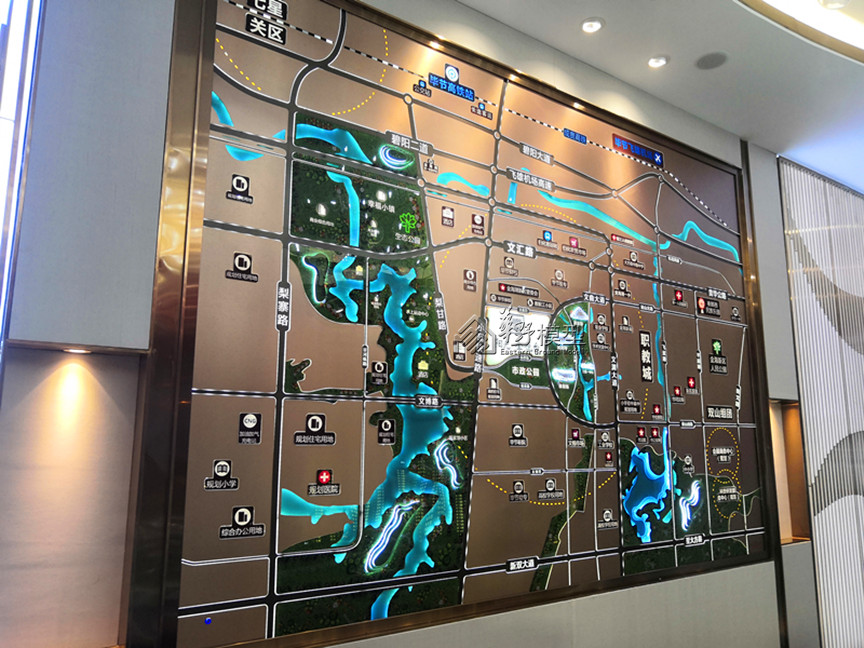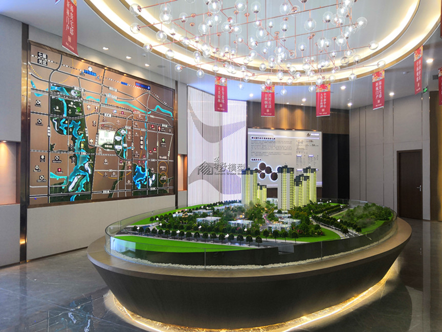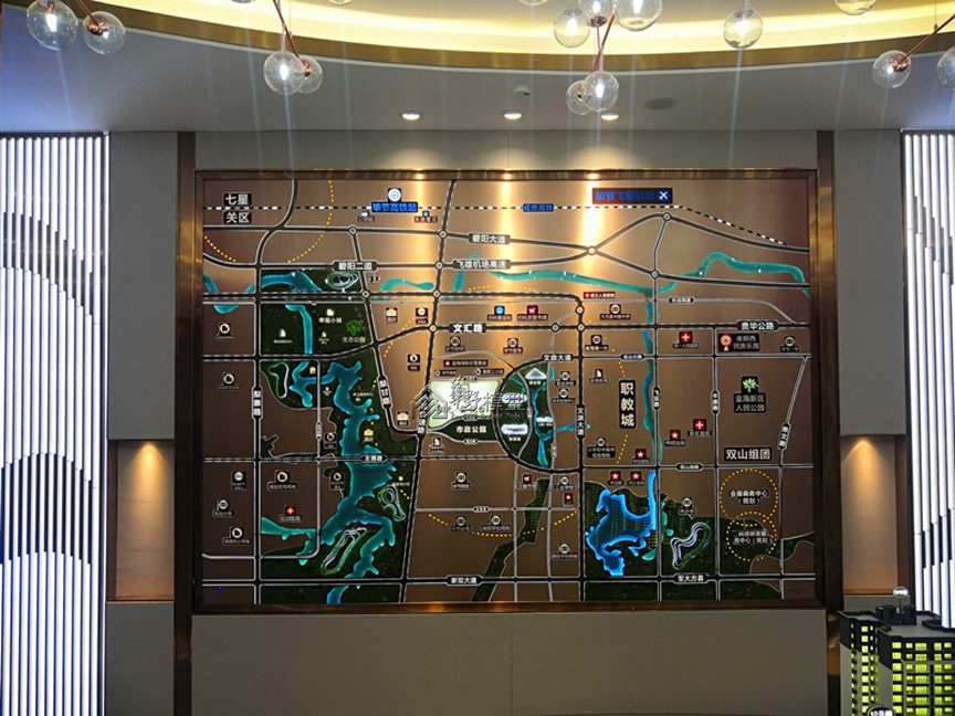 景观:大沙盘景观全部写实, 铺装采用3D打印制作,周边道路采用不锈钢透灯光制作,公园采用雾化效果制作,园区内景观,,马路采用不锈钢金属漆制作,小沙盘景观全部写实,公园不加雾化.